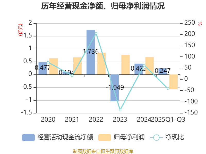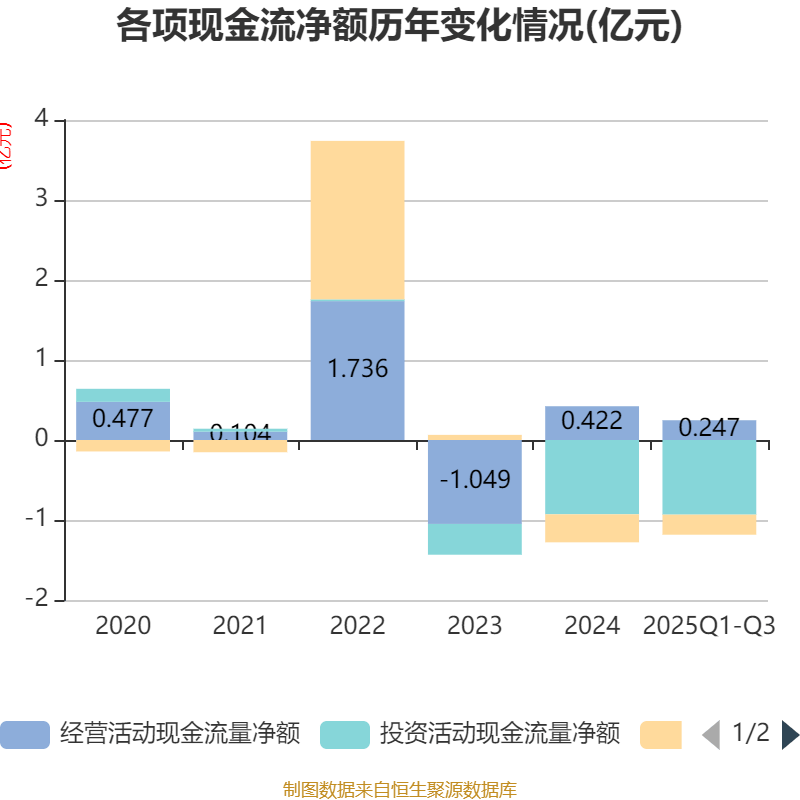 2025年前三季度,公司经营活动现金流净额为2466.03万元,同比增长48.02%;筹资活动现金流净额-2513.28万元,同比减少1560.36万元;投资活动现金流净额-9331.59万元,上年同期为-1.54亿元。
