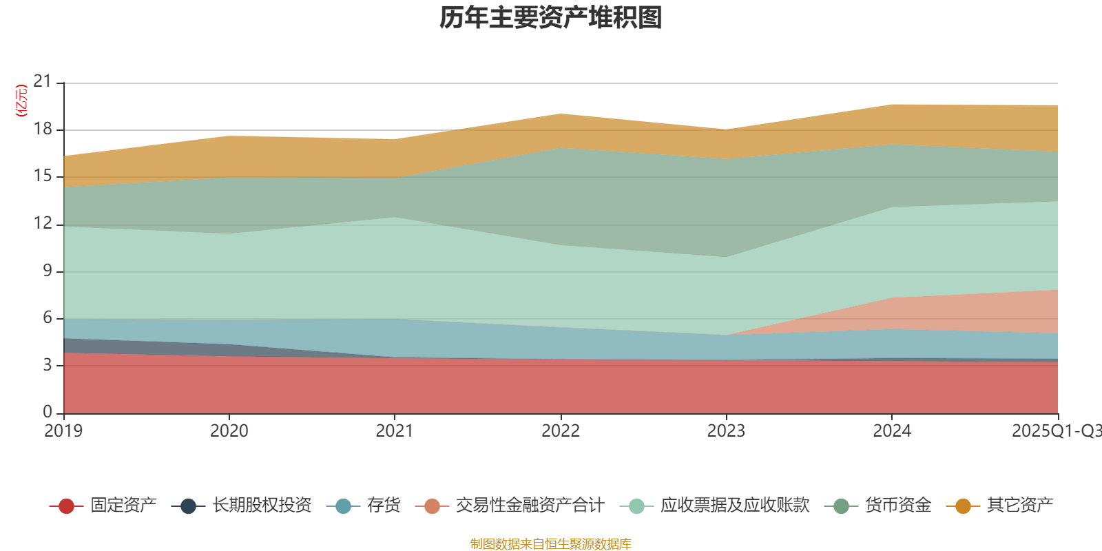 资产重大变化方面,截至2025年三季度末,公司货币资金较上年末减少20.84%,占公司总资产比重下降4.2个百分点;交易性金融资产合计较上年末增加38.53%,占公司总资产比重上升3.95个百分点;递延所得税资产较上年末增加56.42%,占公司总资产比重上升1.27个百分点;存货较上年末减少11.89%,占公司总资产比重下降1.09个百分点。