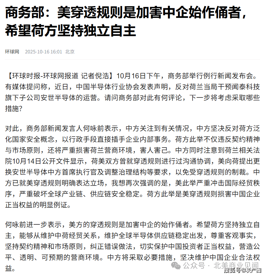 中方同时注意到荷兰相关法院10月14日公开文件显示,荷美双方曾就穿透规则进行过沟通协调,美向荷提出更换安世半导体中方首席执行官及调整治理结构等要求,以免受穿透规则的制裁。中方已就美穿透规则明确表达立场,我想再次强调的是,美此举严重冲击国际经贸秩序,严重破坏全球产业链、供应链安全稳定。荷方此举是美穿透规则损害中国企业正当权益的明显例证。