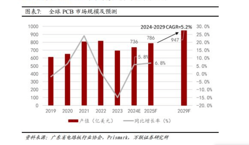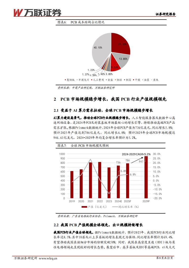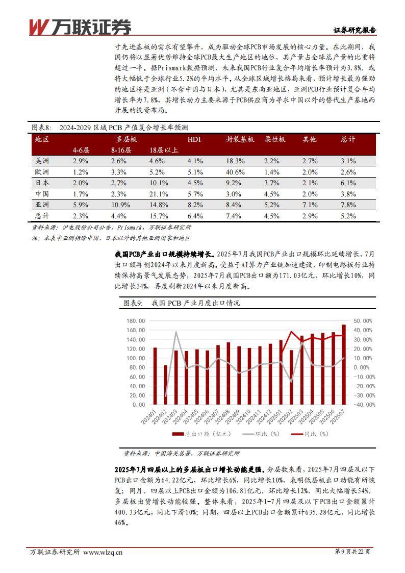 印制电路板(PCB)被称为“电子产品之母”,无论是AI服务器、数据中心,还是新能源汽车、消费电子、工业控制,几乎所有数字化产品都依赖于多层电路板。2024年全球PCB产值达到736亿美元,同比增长5.8%;预计2025年将达786亿美元,2029年有望突破947亿美元。中国PCB行业产值长期居全球首位,预计2025年同比增速8.5%,尤其在18层及以上高多层板领域,市场份额有望突破50%。7月我国PCB出口额再创月度新高,四层以上多层板同比大幅增长54%。