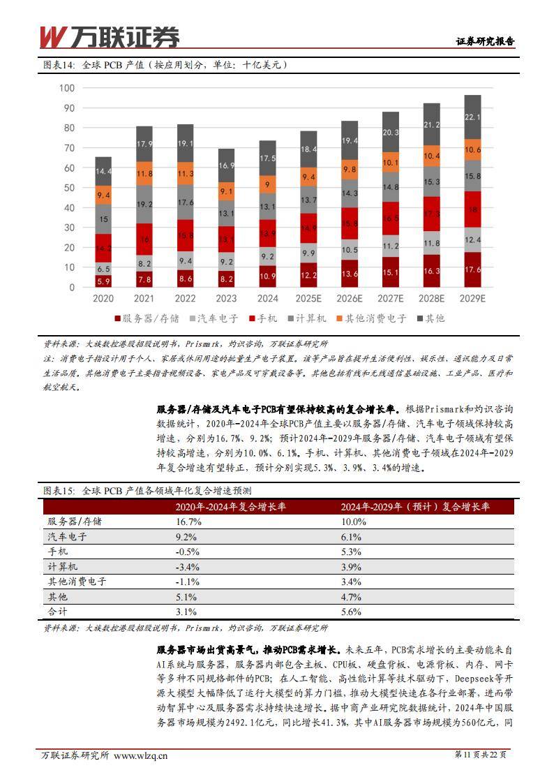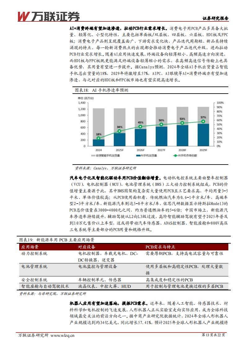 下游场景由服务器、存储和汽车电子主导,2024年服务器/存储PCB产值同比增长16.7%,2025年预计继续保持10%以上增速。汽车PCB随电控系统、智能座舱、辅助驾驶等升级,单车PCB面积最高可达8平米,远超传统燃油车。AI+消费终端和机器人渗透率提升,对HDI、FPC板等产品结构提出更高要求。