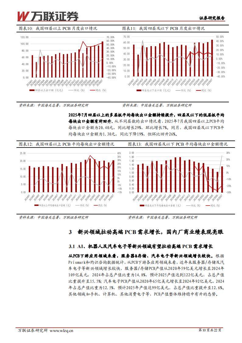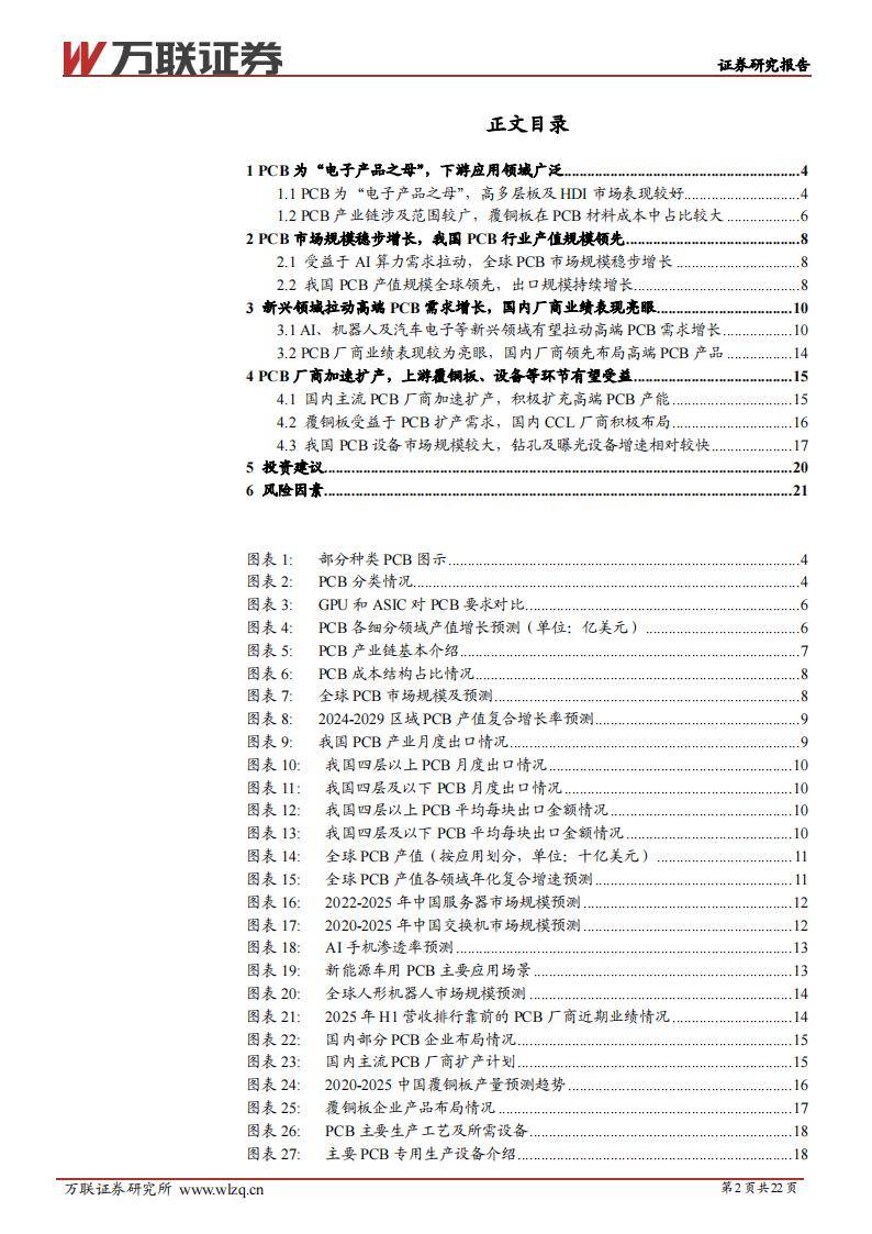 本次研究围绕全球与中国PCB市场的产值规模、产业链环节、公司布局、下游应用结构、新技术迭代、设备和材料端投资机遇进行了系统梳理,列出了AI服务器、汽车电子、机器人等拉动高端PCB需求增长的核心赛道,统计了各类PCB的分层结构和出口数据,同时细化了上游材料(覆铜板、铜箔等)、中游制造和下游主要应用场景的最新进展,全面梳理出值得关注的公司名单和投资逻辑。
