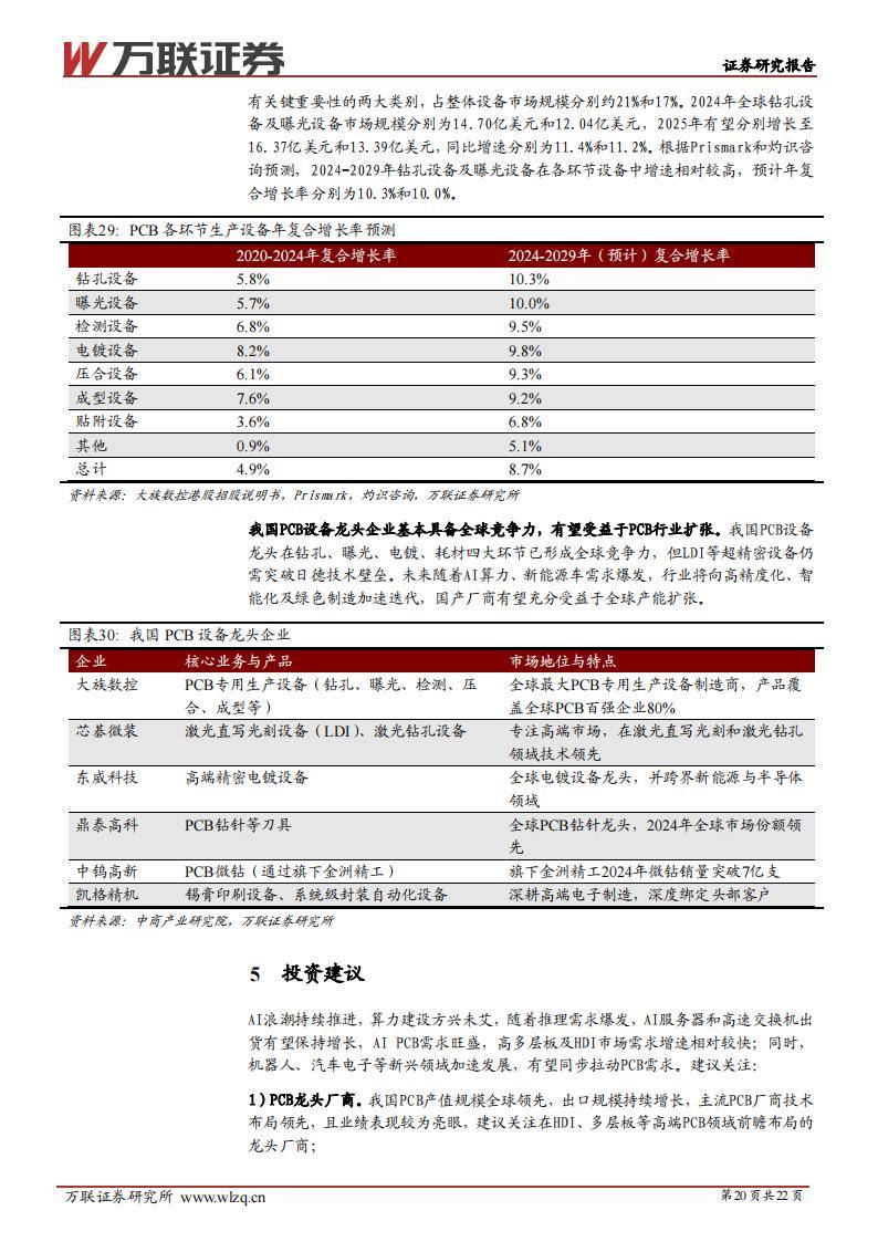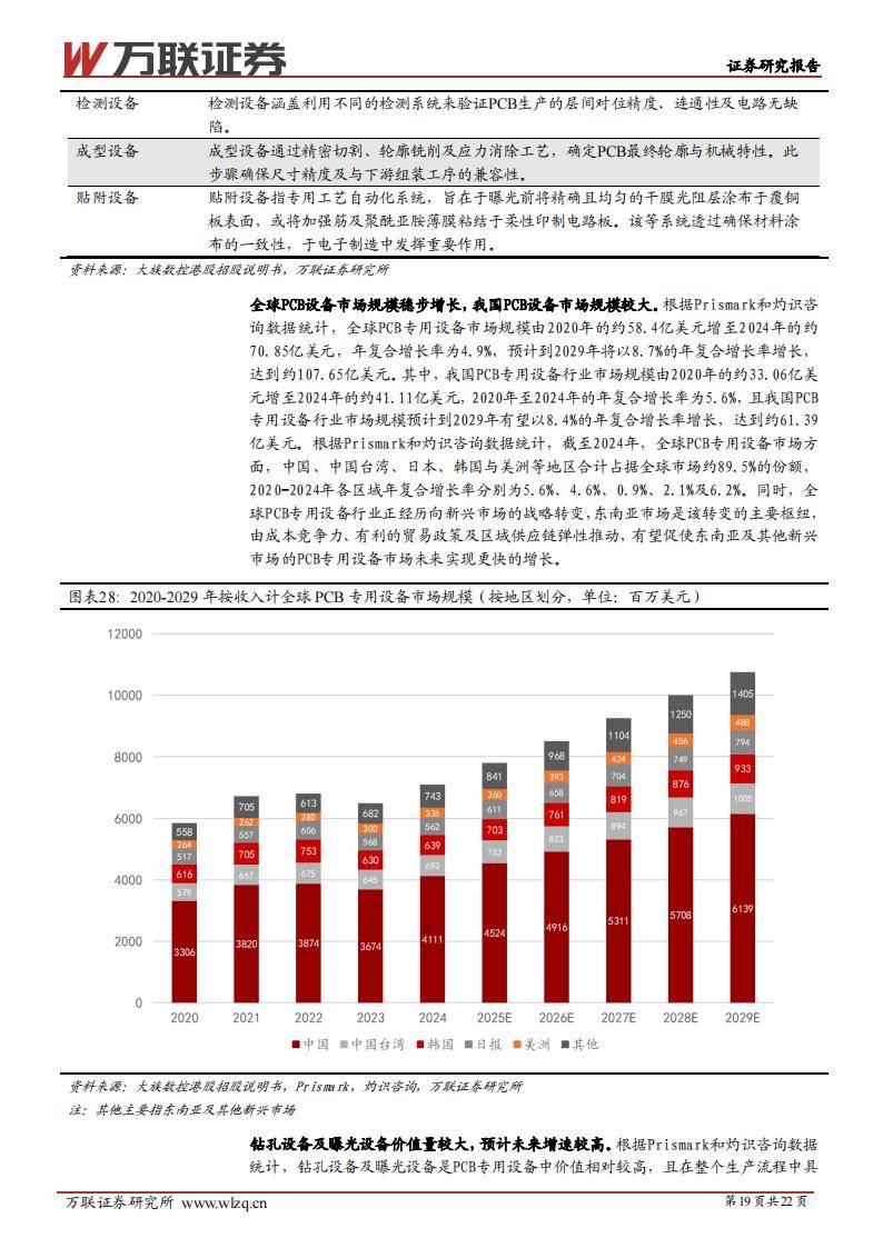PCB专用设备领域,大族数控为全球最大PCB设备制造商,芯碁微装、东威科技、鼎泰高科、中钨高新等在激光直写、钻孔、电镀、刀具耗材等环节具备全球竞争力。2024年全球PCB设备市场规模达70.85亿美元,预计2029年将超107亿美元。国内设备厂商市场份额持续提升,钻孔与曝光设备市场增速尤为突出。