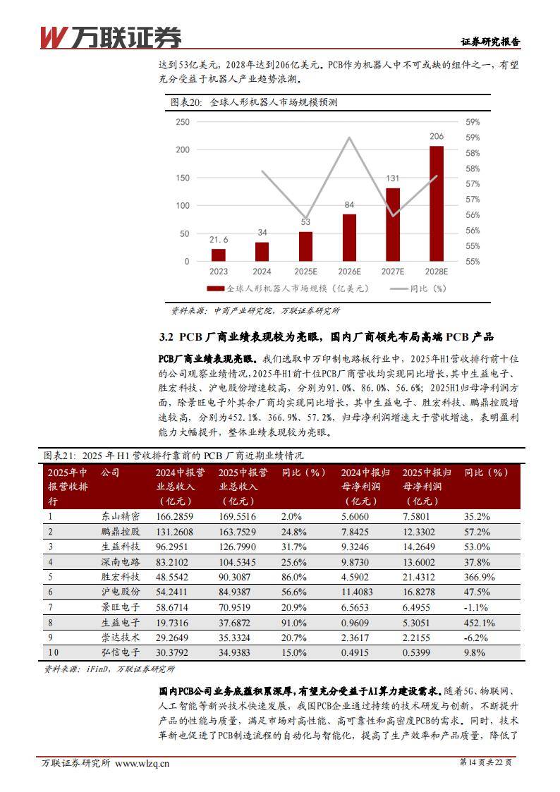 AI大模型训练、智算中心、AI服务器是高多层板与HDI板的最大拉动力。以英伟达Blackwell架构为例,单卡需20层以上多层HDI板,且全部采用低损耗覆铜板以提升信号完整性。2024年高多层板(18层及以上)市场同比增长40.3%,HDI板产值大增18.8%。封装基板市场2024年虽微涨0.8%,但2025年预计复苏,BT类基板增速显著。FPC软板受益于智能手机创新与国产替代,预计2025年小幅增长3.6%。汽车电子化也使得PCB单车用量翻倍,特斯拉Model3单车PCB价值达3000–4000元,是燃油车5–6倍。机器人领域同样加速拉动高端板需求,2024年全球人形机器人产业规模同比增长57.41%。