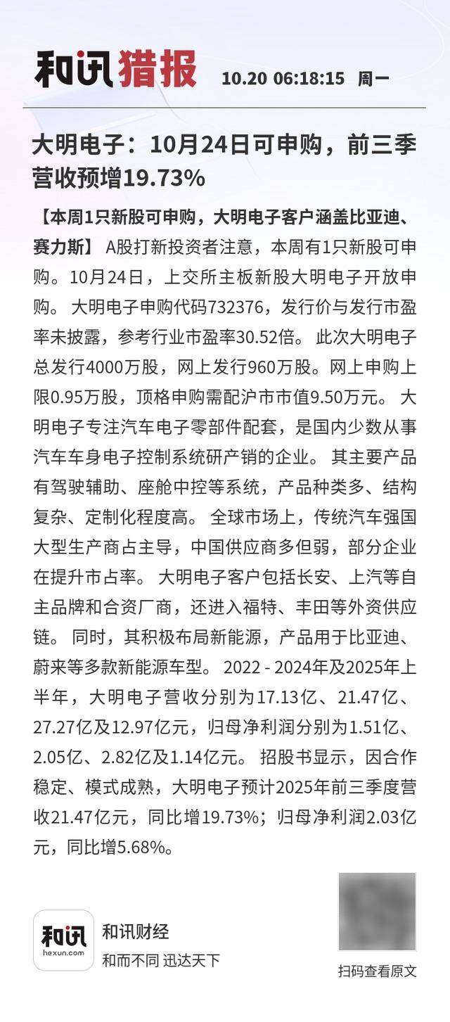 【本周1只新股可申购,大明电子客户涵盖比亚迪、赛力斯】A股打新投资者注意,本周有1只新股可申购。10月24日,上交所主板新股大明电子开放申购。 大明电子申购代码732376,发行价与发行市盈率未披露,参考行业市盈率30.52倍。 此次大明电子总发行4000万股,网上发行960万股。网上申购上限0.95万股,顶格申购需配沪市市值9.50万元。 大明电子专注汽车电子零部件配套,是国内少数从事汽车车身电子控制系统研产销的企业。 其主要产品有驾驶辅助、座舱中控等系统,产品种类多、结构复杂、定制化程度高。 全球市场上,传统汽车强国大型生产商占主导,中国供应商多但弱,部分企业在提升市占率。 大明电子客户包括长安、上汽等自主品牌和合资厂商,还进入福特、丰田等外资供应链。 同时,其积极布局新能源,产品用于比亚迪、蔚来等多款新能源车型。 2022 - 2024年及2025年上半年,大明电子营收分别为17.13亿、21.47亿、27.27亿及12.97亿元,归母净利润分别为1.51亿、2.05亿、2.82亿及1.14亿元。 招股书显示,因合作稳定、模式成熟,大明电子预计2025年前三季度营收21.47亿元,同比增19.73%;归母净利润2.03亿元,同比增5.68%。