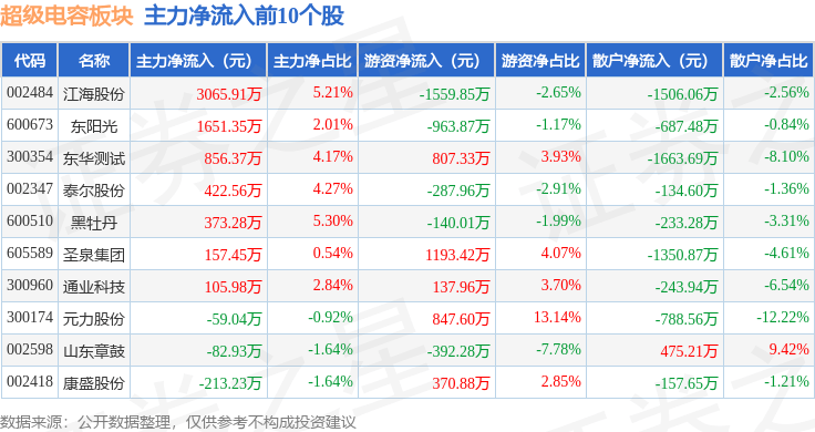 从资金流向上来看,当日超级电容板块主力资金净流出8.84亿元,游资资金净流入1.81亿元,散户资金净流入7.02亿元。超级电容板块个股资金流向见下表:
