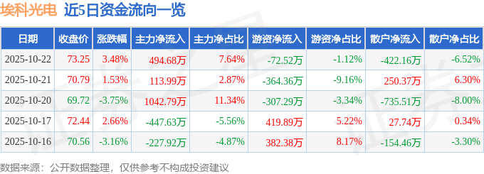 10月22日的资金流向数据方面,主力资金净流入494.68万元,占总成交额7.64%,游资资金净流出72.52万元,占总成交额1.12%,散户资金净流出422.16万元,占总成交额6.52%。