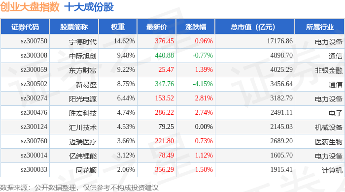 证券之星消息,10月23日,创业大盘(399293)指数报收于6173.08点,涨0.08%,成交1098.68亿元,换手率1.79%。当日该指数成份股中,上涨的有31家,阳光电源以2.81%的涨幅领涨,下跌的有18家,天孚通信以6.36%的跌幅领跌。