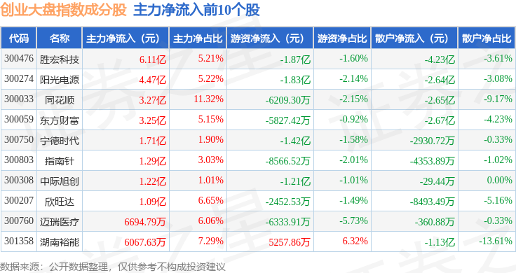 资金流向方面,创业大盘(399293)指数成份股当日主力资金净流出合计9.17亿元,游资资金净流出合计9369.18万元,散户资金净流入合计10.1亿元。成份股资金流向详情见下表: