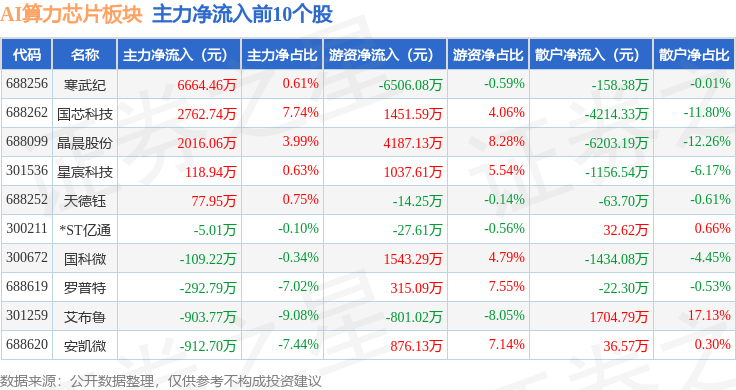 从资金流向上来看,当日AI算力芯片板块主力资金净流出10.72亿元,游资资金净流入6.28亿元,散户资金净流入4.44亿元。AI算力芯片板块个股资金流向见下表: