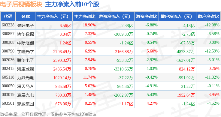 从资金流向上来看,当日电子后视镜板块主力资金净流入4.83亿元,游资资金净流出1.53亿元,散户资金净流出3.3亿元。电子后视镜板块个股资金流向见下表: