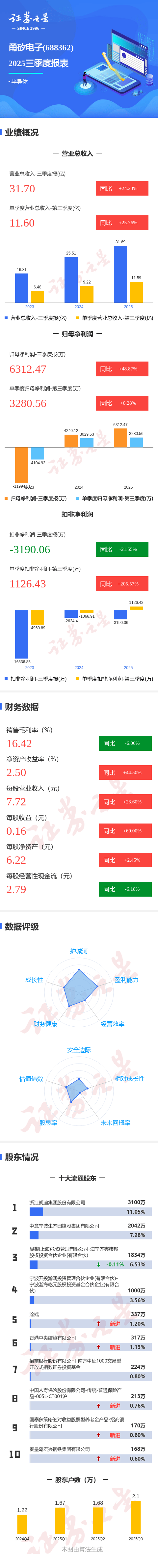 证券之星消息,甬矽电子2025年三季报显示,公司主营收入31.7亿元,同比上升24.23%;归母净利润6312.47万元,同比上升48.87%;扣非净利润-3190.06万元,同比下降21.55%;其中2025年第三季度,公司单季度主营收入11.6亿元,同比上升25.76%;单季度归母净利润3280.56万元,同比上升8.29%;单季度扣非净利润1126.43万元,同比上升205.58%;负债率73.39%,财务费用1.63亿元,毛利率16.42%。