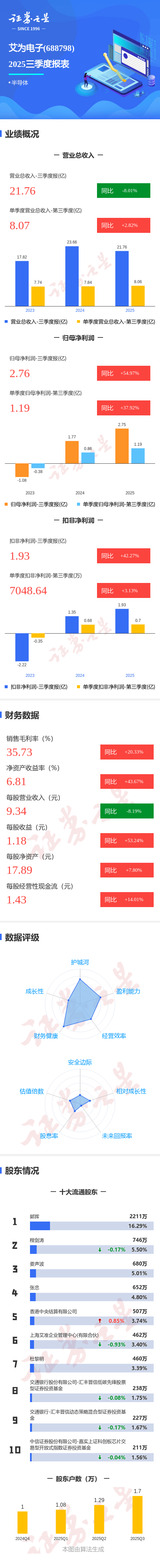 证券之星消息,艾为电子2025年三季报显示,公司主营收入21.76亿元,同比下降8.02%;归母净利润2.76亿元,同比上升54.98%;扣非净利润1.93亿元,同比上升42.27%;其中2025年第三季度,公司单季度主营收入8.07亿元,同比上升2.83%;单季度归母净利润1.19亿元,同比上升37.93%;单季度扣非净利润7048.64万元,同比上升3.13%;负债率20.45%,投资收益5303.3万元,财务费用-61.17万元,毛利率35.73%。