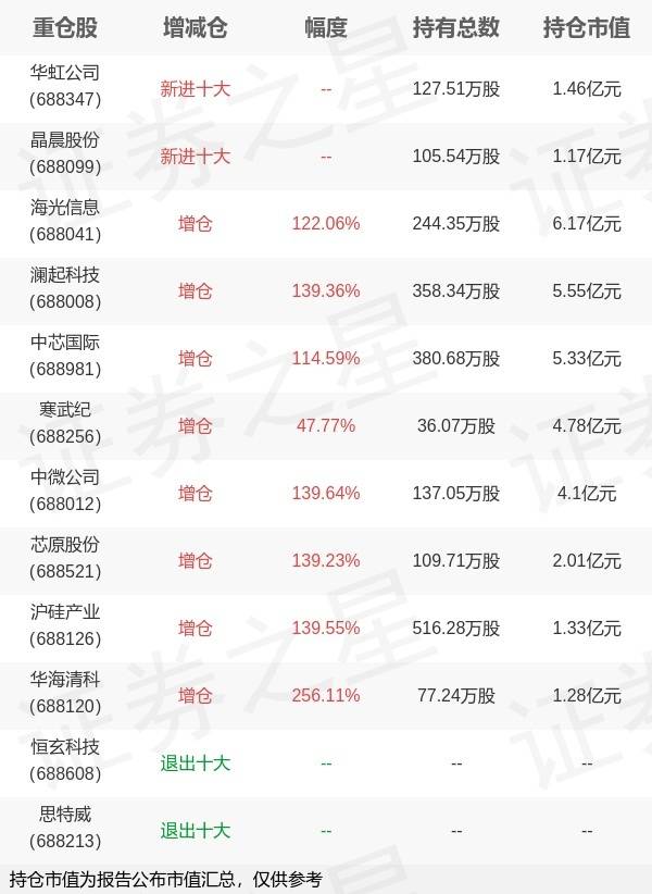 证券之星消息,10月28日汇添富基金旗下孙浩管理的汇添富上证科创板芯片交易型开放式指数基金公布三季报。与上一季度相比,该基金前十大重仓股新增华虹公司,晶晨股份;并对海光信息增仓134.31万股,为该基金第一大重仓股;恒玄科技,思特威等退出前十大重仓股;详细数据如下: