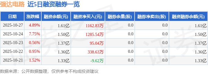 证券之星消息,截至2025年10月27日收盘,强达电路(301628)报收于91.83元,上涨4.89%,换手率20.99%,成交量3.95万手,成交额3.58亿元。