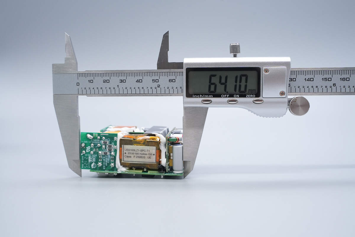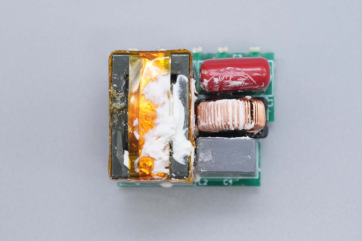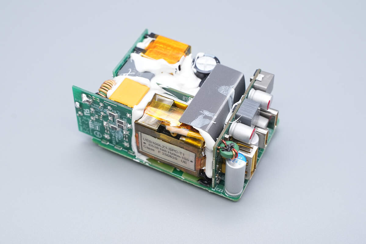 PCBA模块由多块小板堆叠设计以充分利用空间,器件间填充白胶提升整体稳定性,初次级间做了隔离绝缘处理。