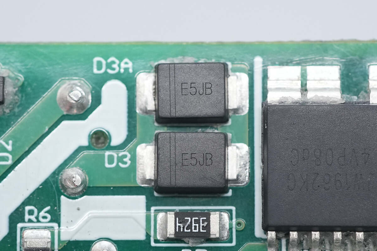 PFC升压整流管采用两颗丝印E5JB超快恢复二极管并联。