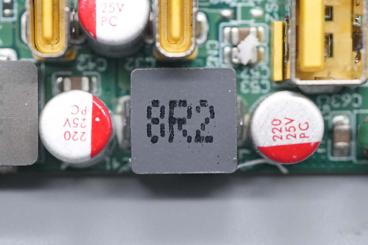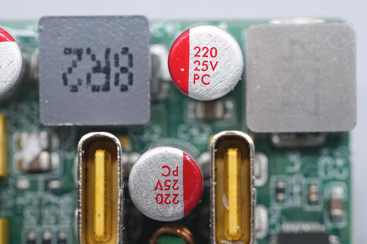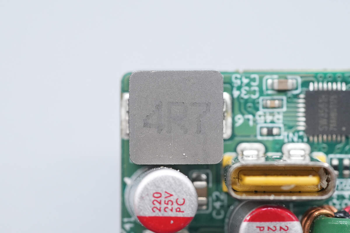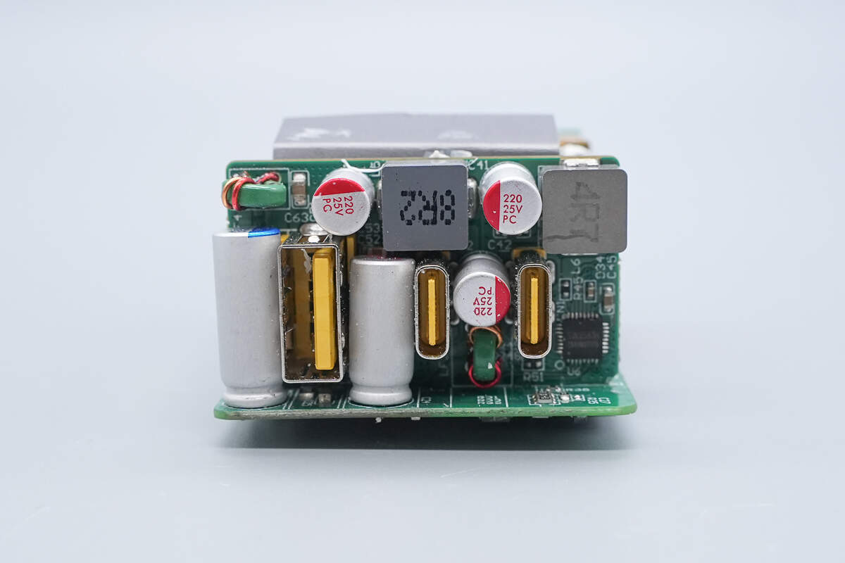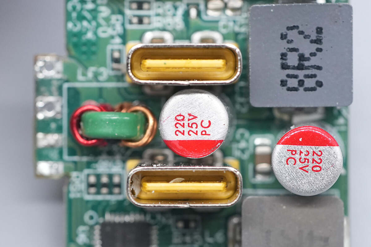 将小板拆下,正面设有USB-C1口的降压协议芯片以及两路二次降压电路对应的降压电感、滤波固态电容、滤波电感。