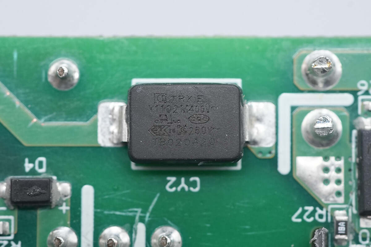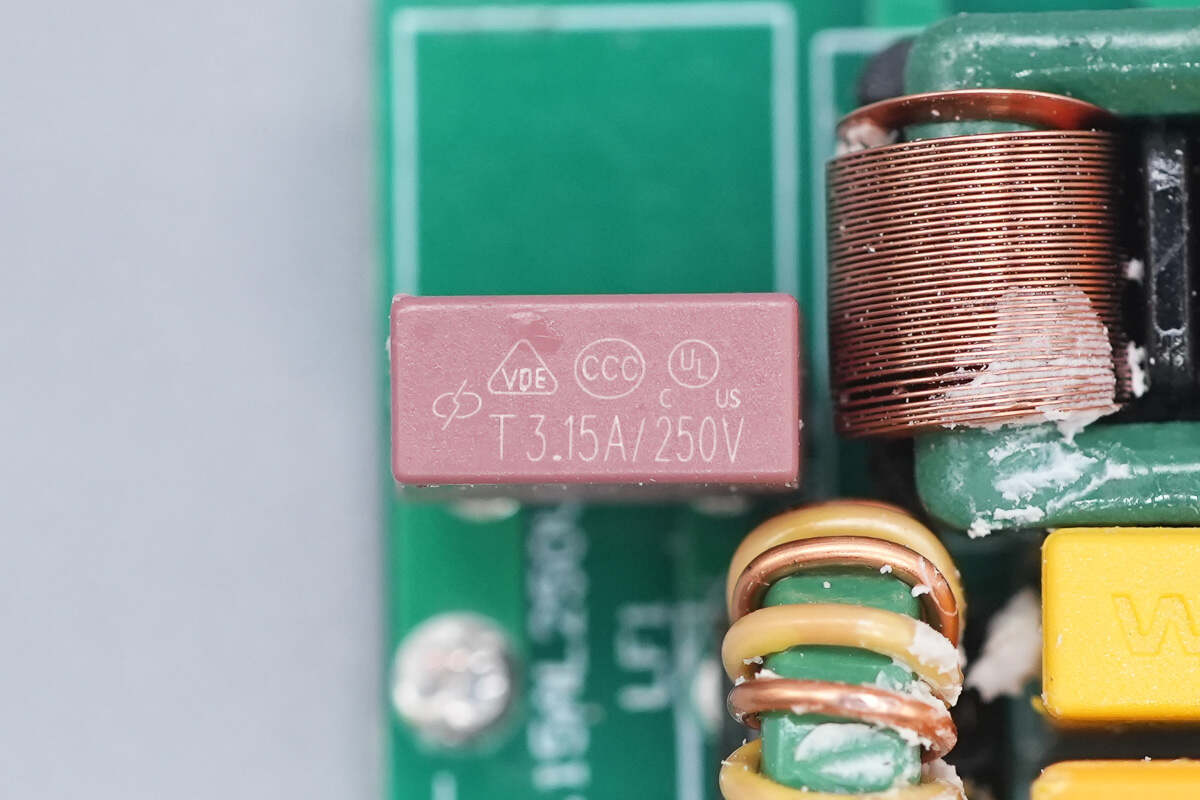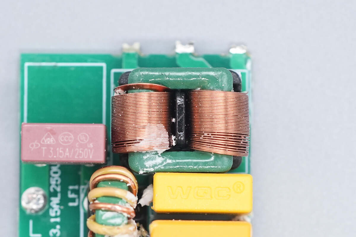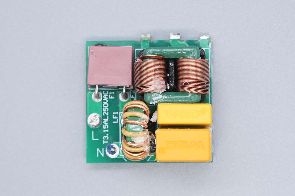 右侧小板正面设有延时保险丝、共模电感、安规X2电容。