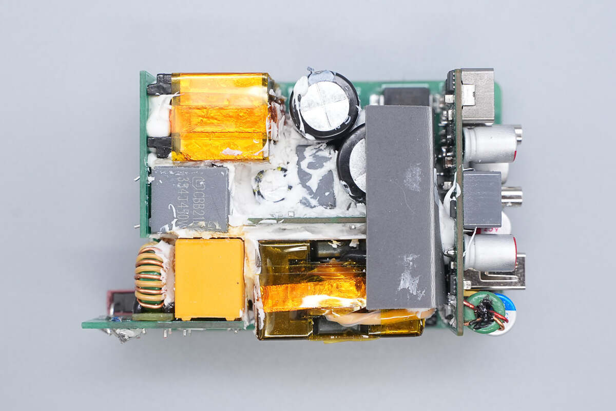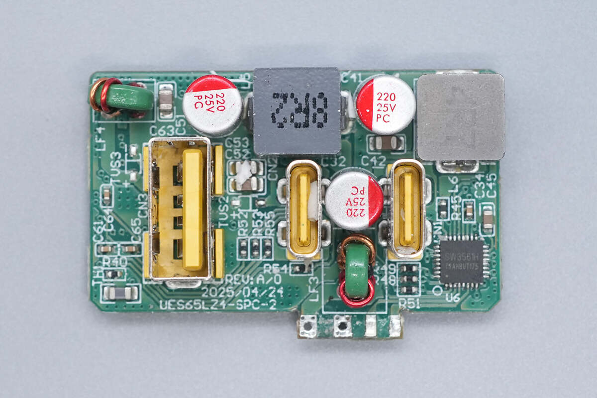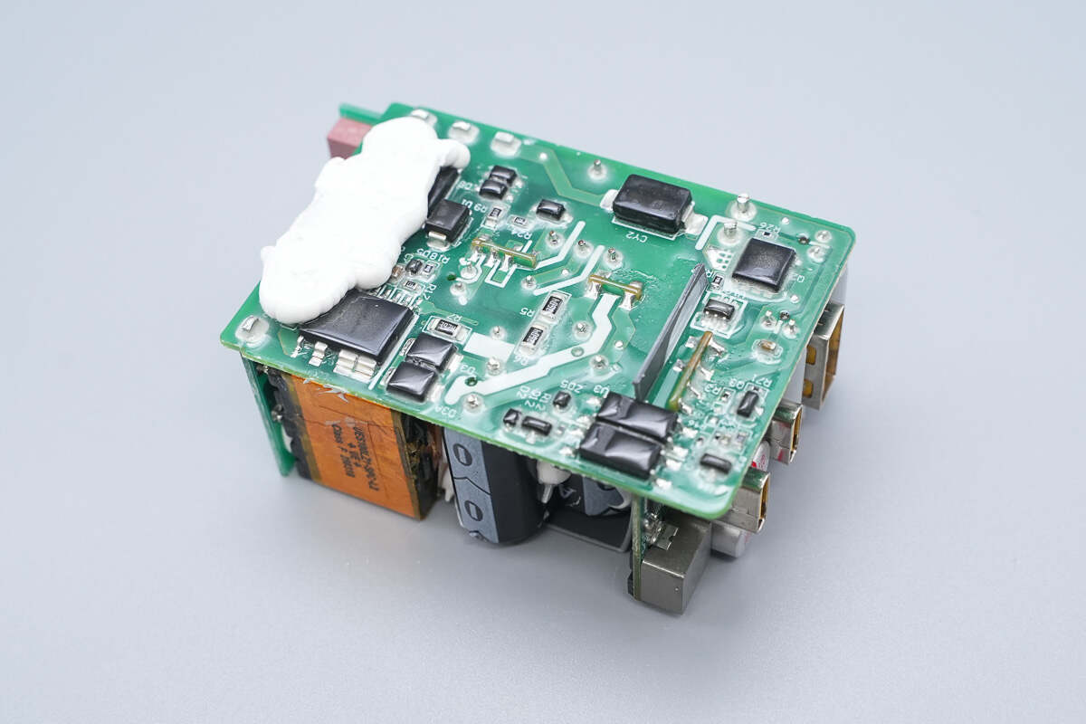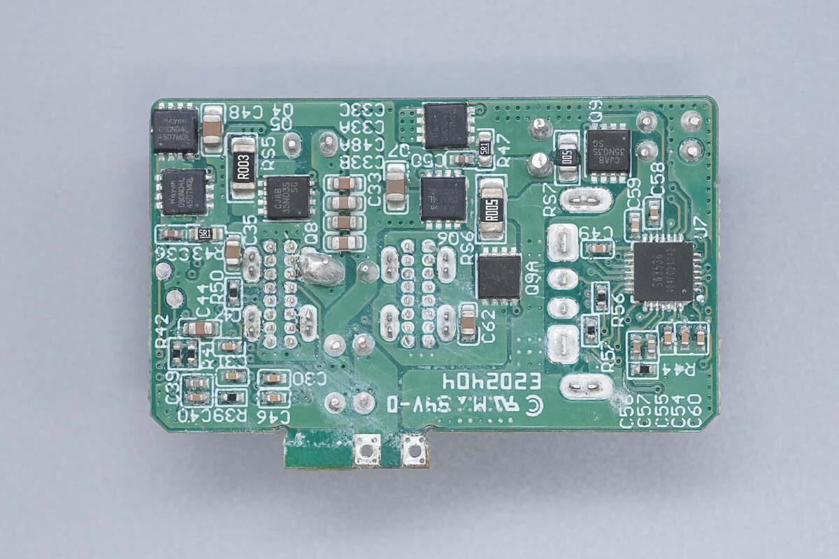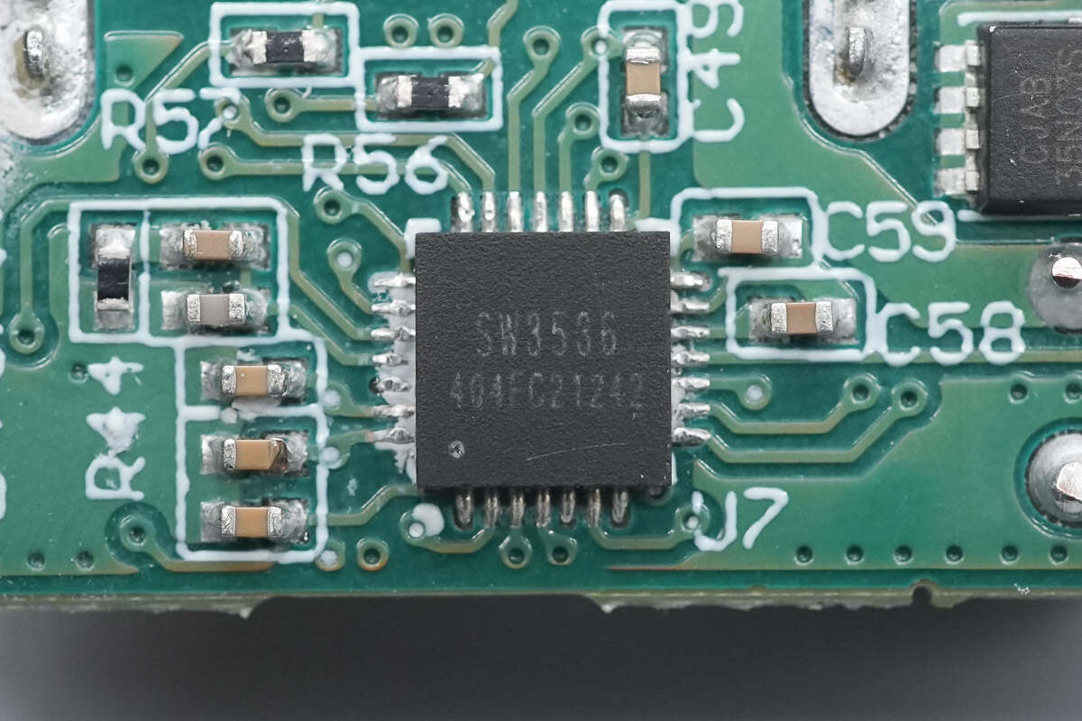 输出端则采用了和65W款相同的两路DC-DC降压电路设计,方案也完全一样,使用了智融科技SW3561H、SW3536两颗SOC快充芯片实现输出控制。PCBA模块采用了多块小板组合焊接,实现了高密度堆叠,此外器件均打胶进行加固处理。