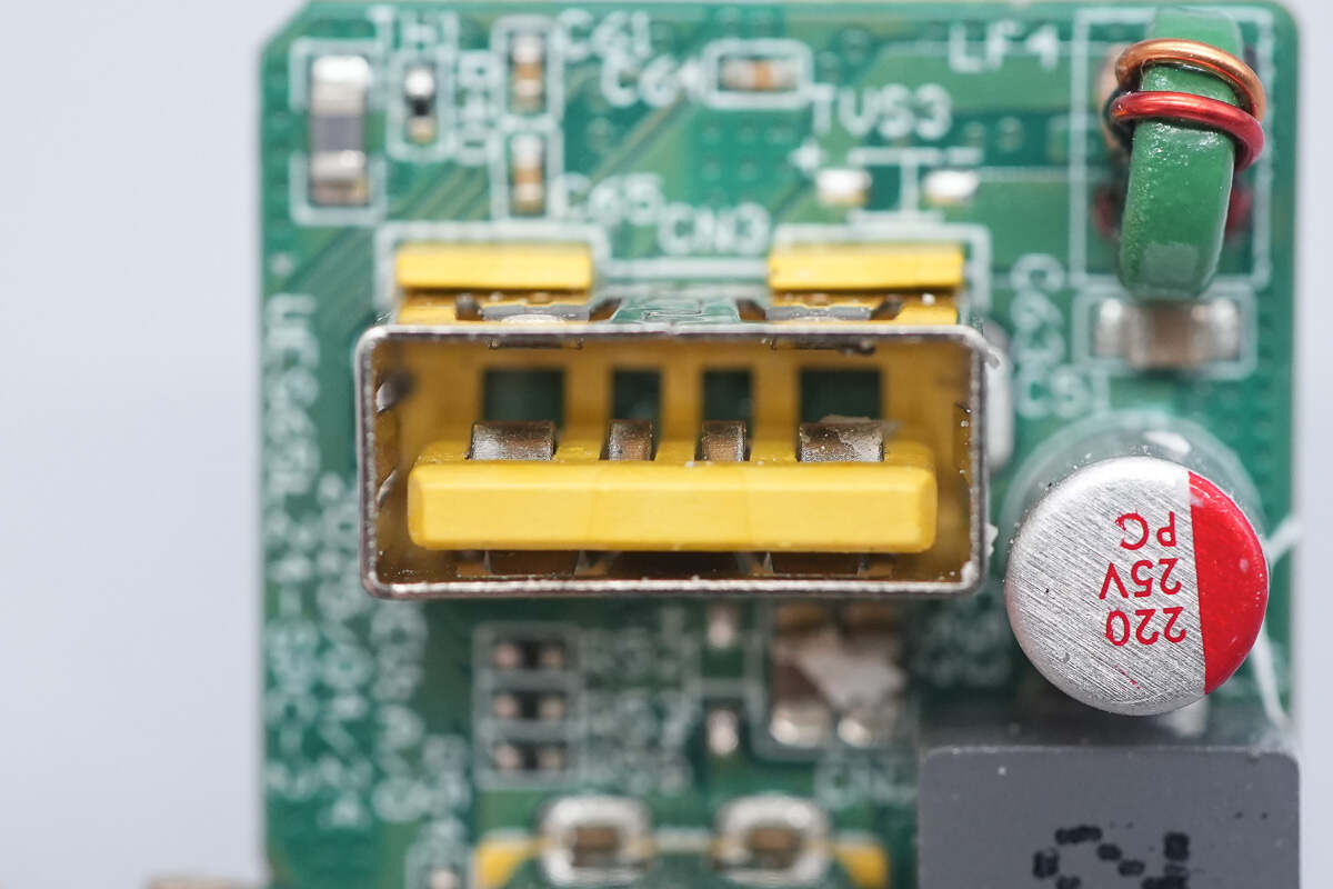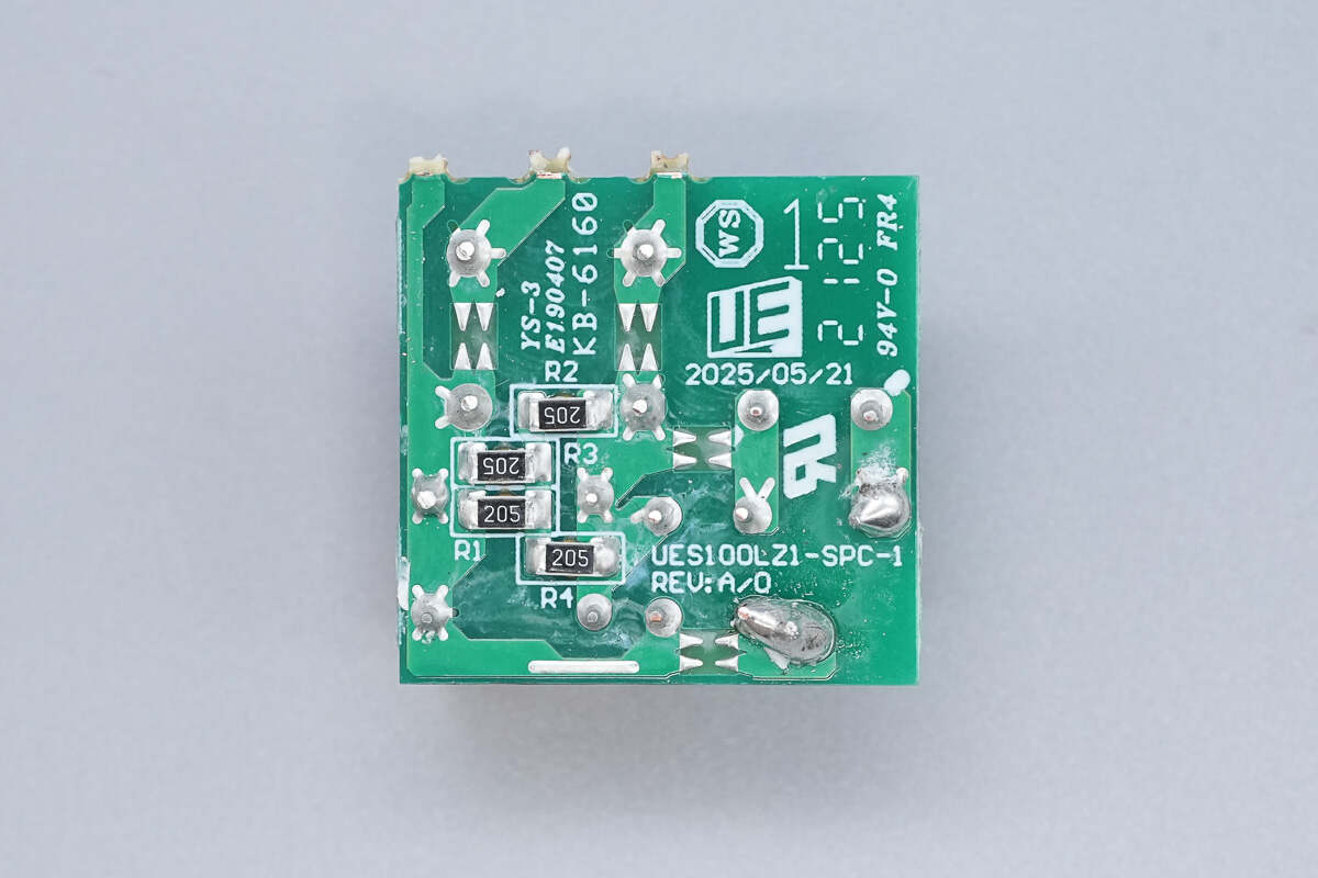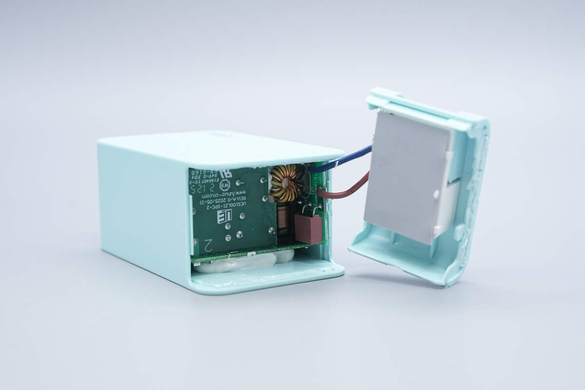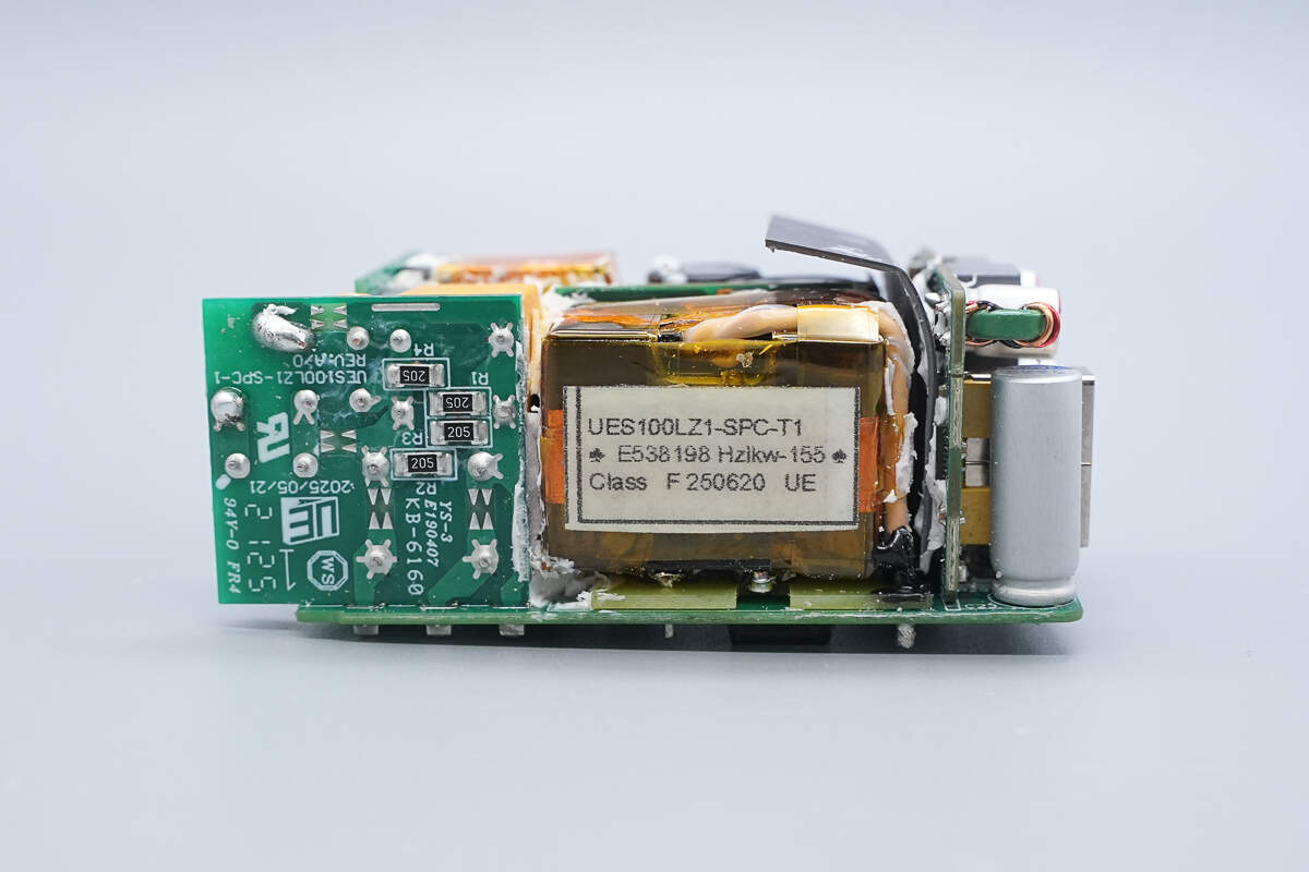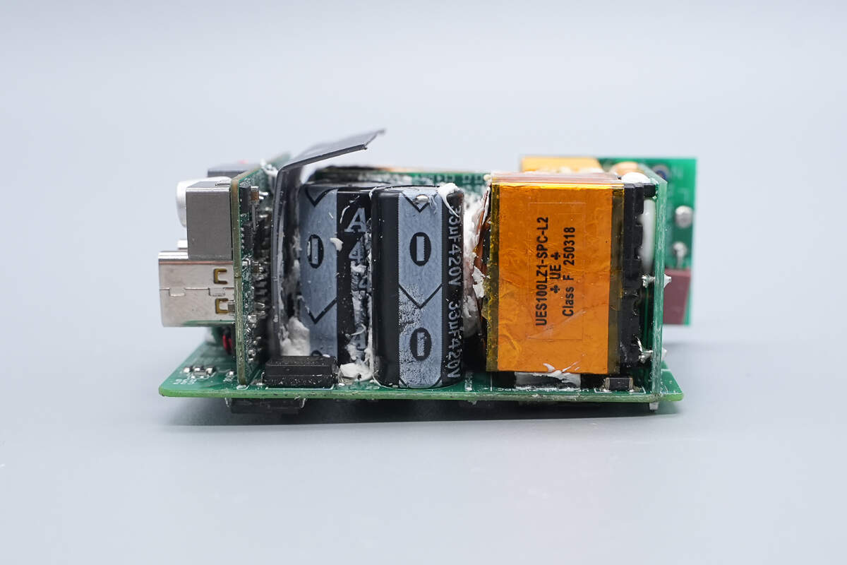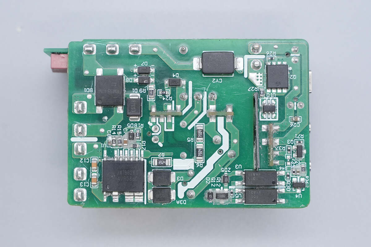 输出端则采用了和65W款相同的两路DC-DC降压电路设计,方案也完全一样,使用了智融科技SW3561H、SW3536两颗SOC快充芯片实现输出控制。PCBA模块采用了多块小板组合焊接,实现了高密度堆叠,此外器件均打胶进行加固处理。