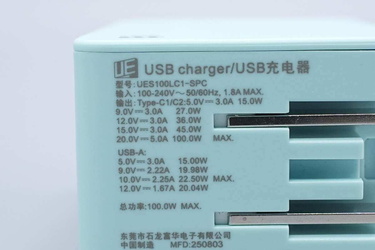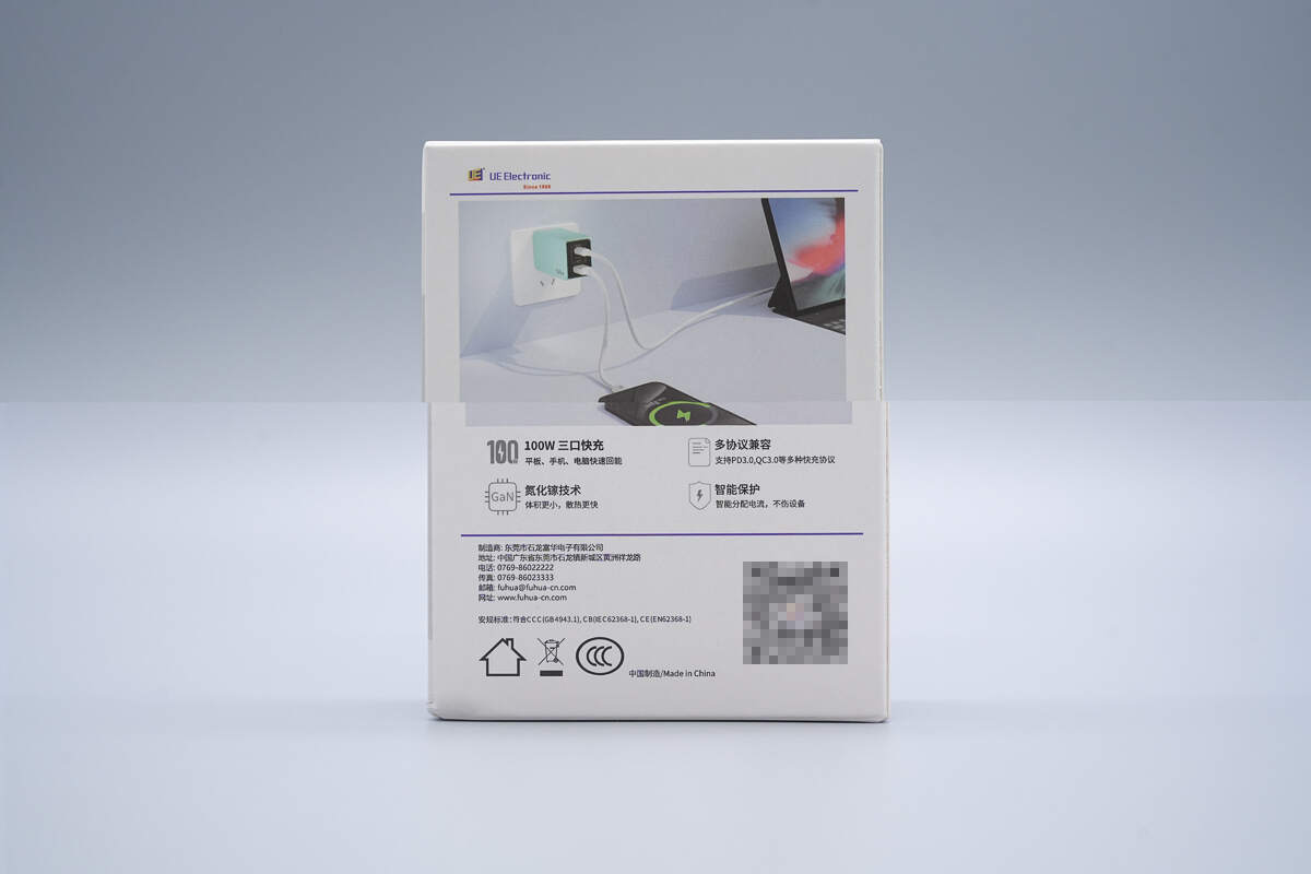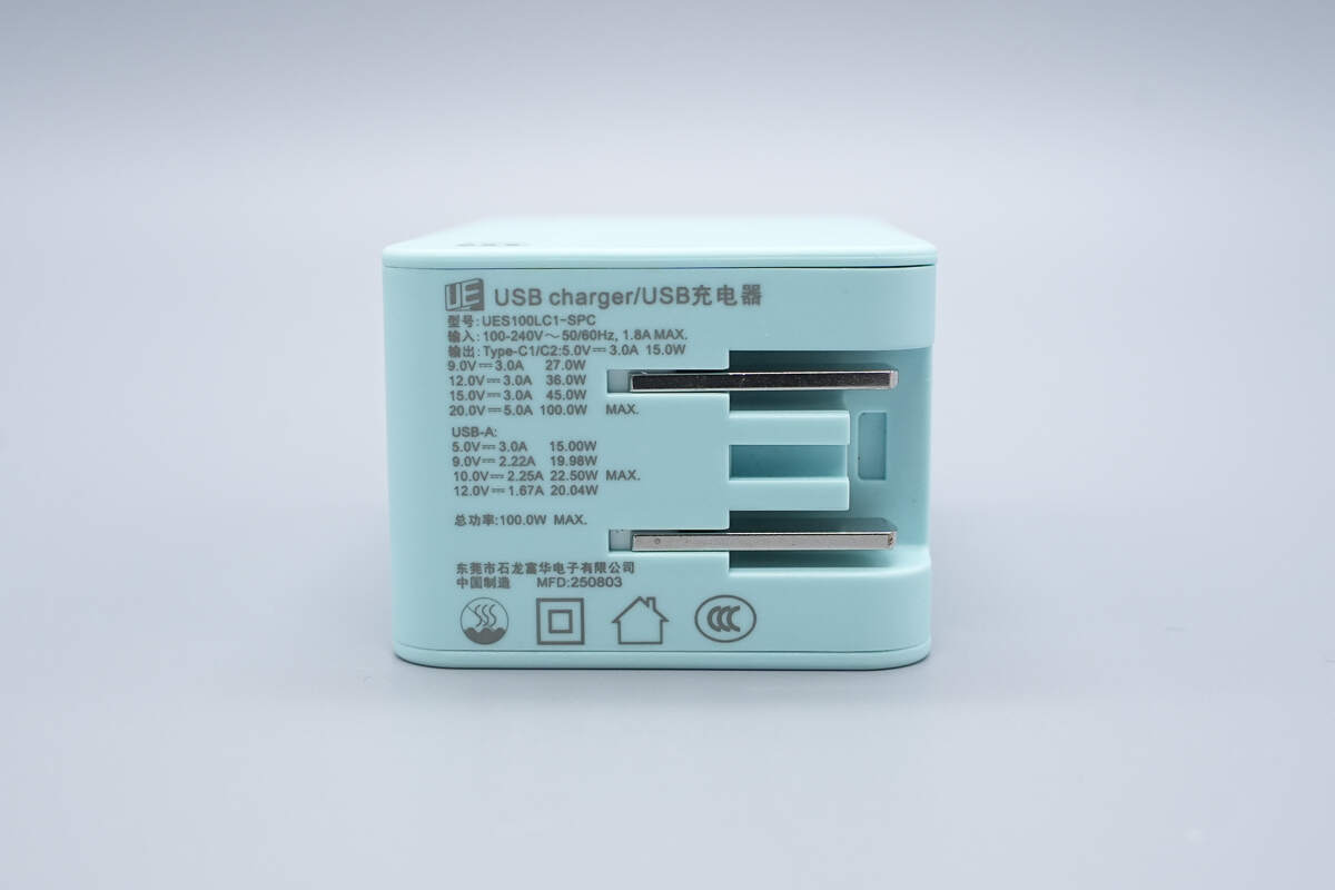 富华电子100W氮化镓充电器采用和65W款相同设计语言,就连三围也完全相同,不过这款绿色配色看上去则相当小清新。