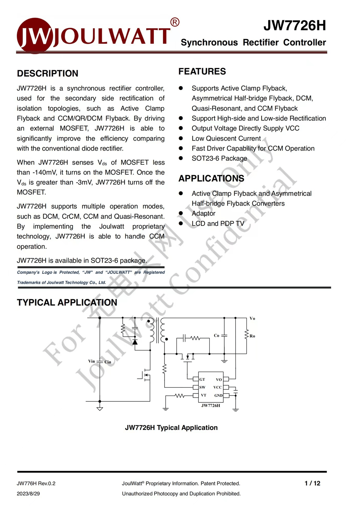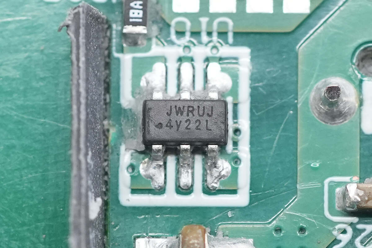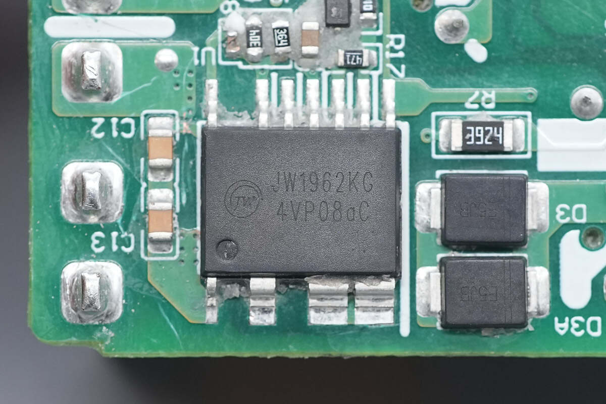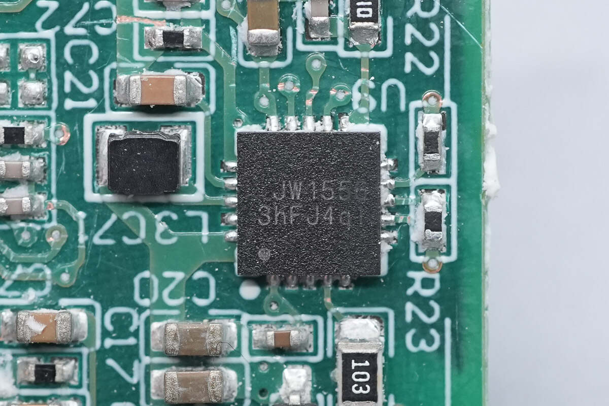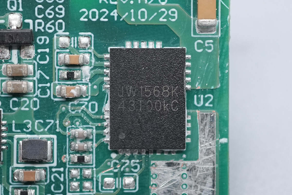 同步整流控制器来自杰华特,丝印JWRU,实际型号为JW7726H,支持ACF,AHB,DCM,QR和CCM反激工作模式,支持高侧和低侧应用,芯片支持直接由输出电压供电,具有极低的静态电流,具备快速驱动能力,用于CCM运行模式。