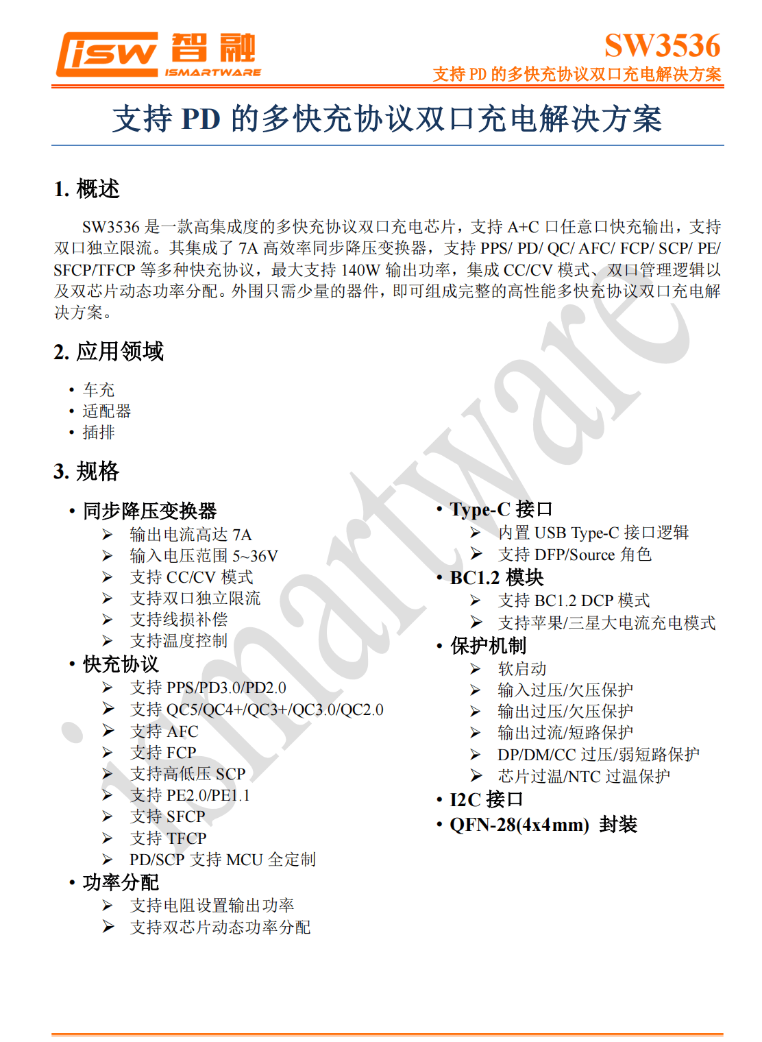 SW3536集成CC/CV模式,双口管理逻辑以及双芯片动态功率分配,外围元件精简,是一颗完整的高性能多快充协议双口充电解决方案。SW3536支持36V输入电压,满足12-24V输入车充应用,适用于快充适配器,插排以及车充应用。