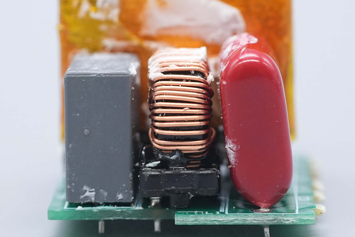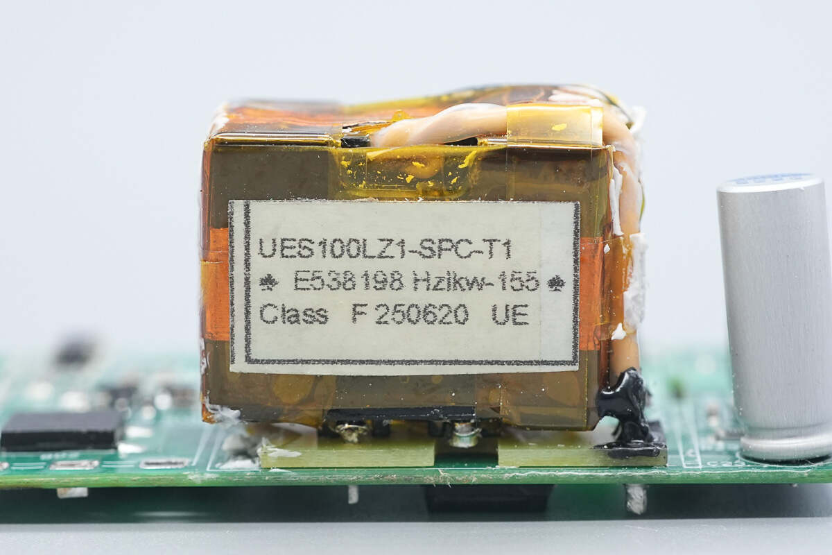 PFC升压电感特写,包裹铜箔以及耐高温绝缘胶带处理。