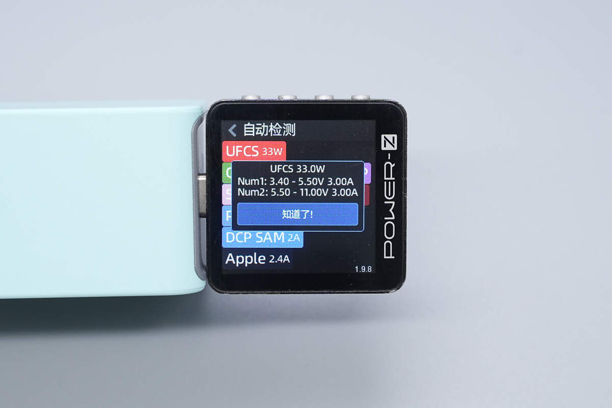 测得UFCS融合快充具备3.4-5.5V3A、5.5-11V3A两组电压档位。