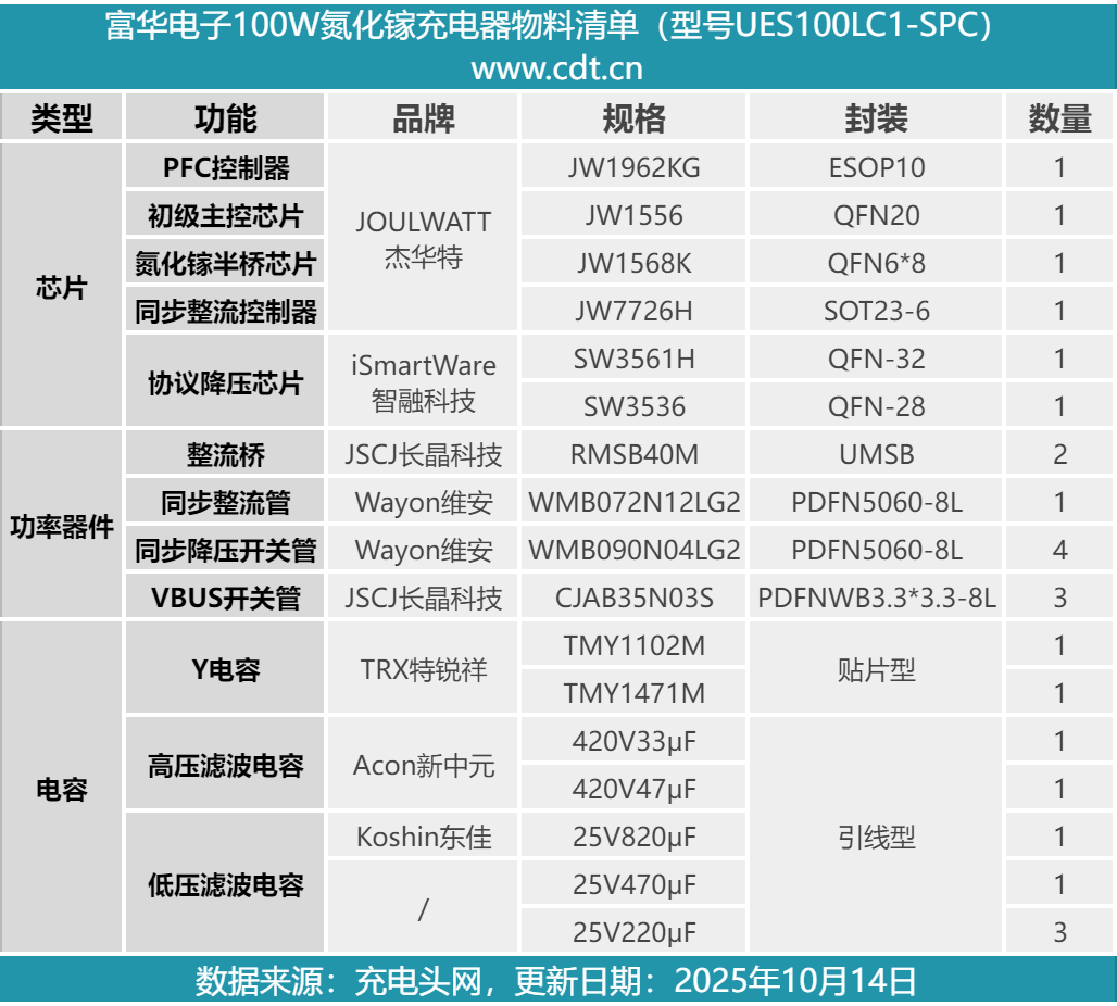 最后附上富华电子100W氮化镓充电器的核心器件清单,方便大家查阅。