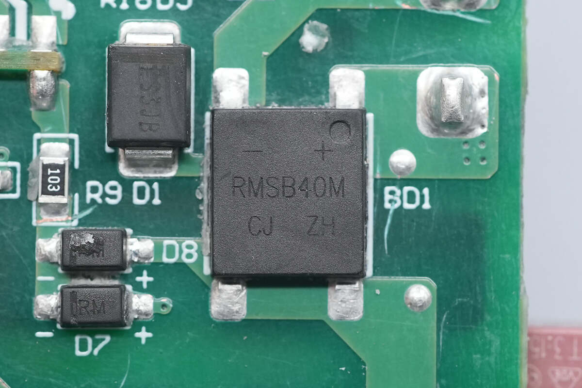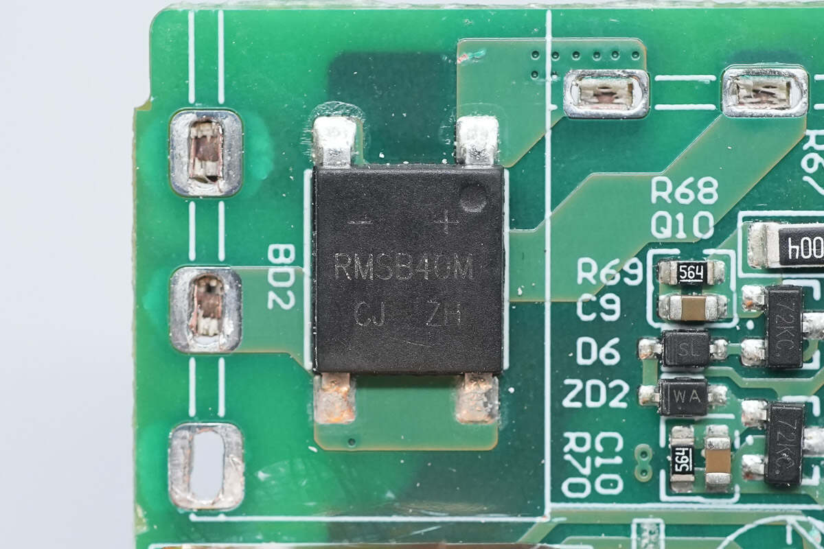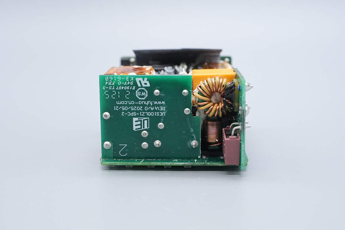 主板背面设有整流桥、PFC升压控制器、光耦、贴片Y电容、同步整流控制器以及同步整流管。