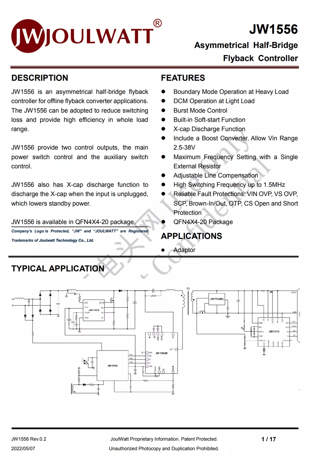 AHB控制器来自杰华特,型号JW1556,是一款非对称半桥反激式控制器,采用QFN4x4-20封装,适用于离线反激式转换器应用。芯片内部集成供电升压转换器,输入电压范围 2.5-38V,最高工作频率达1.5MHz,支持65-300W快充应用。