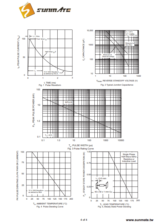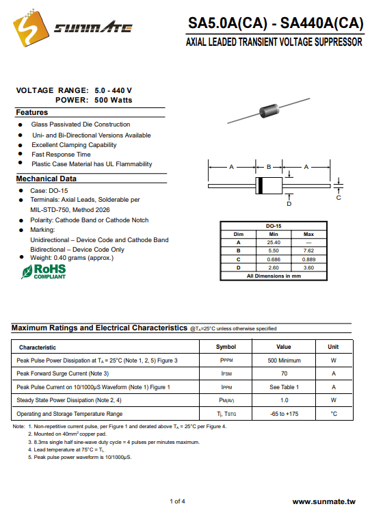 500W峰值脉冲功率能力,a10/10004波,重复率(dutycycle):0.01%高温焊接保证:260*C/10秒