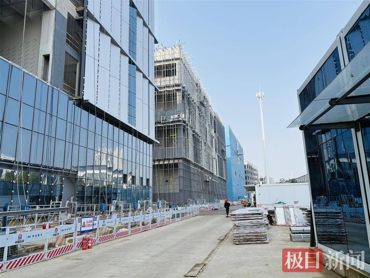 上午10时许,极目新闻记者由九龙湖街一侧进入基地。4栋生产厂房呈线型分布,成为基地的视觉焦点。厂房采用公建化外立面,大面积玻璃幕墙搭配超大铝板,颇具科技感。在层高约9米的B3生产厂房内,银白色通风管道布设规整,工人们正在进行室内的洁净装饰装修施工。