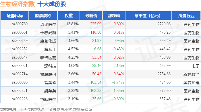 证券之星消息,10月28日,生物经济(970038)指数报收于2277.51点,跌0.16%,成交188.83亿元,换手率1.2%。当日该指数成份股中,上涨的有23家,我武生物以6.71%的涨幅领涨,下跌的有27家,美亚光电以3.02%的跌幅领跌。
