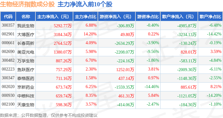 资金流向方面,生物经济(970038)指数成份股当日主力资金净流出合计8.71亿元,游资资金净流入合计3.27亿元,散户资金净流入合计5.44亿元。成份股资金流向详情见下表: