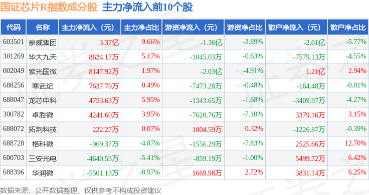 资金流向方面,国证芯片R(480017)指数成份股当日主力资金净流出合计48.68亿元,游资资金净流入合计18.69亿元,散户资金净流入合计30.0亿元。成份股资金流向详情见下表: