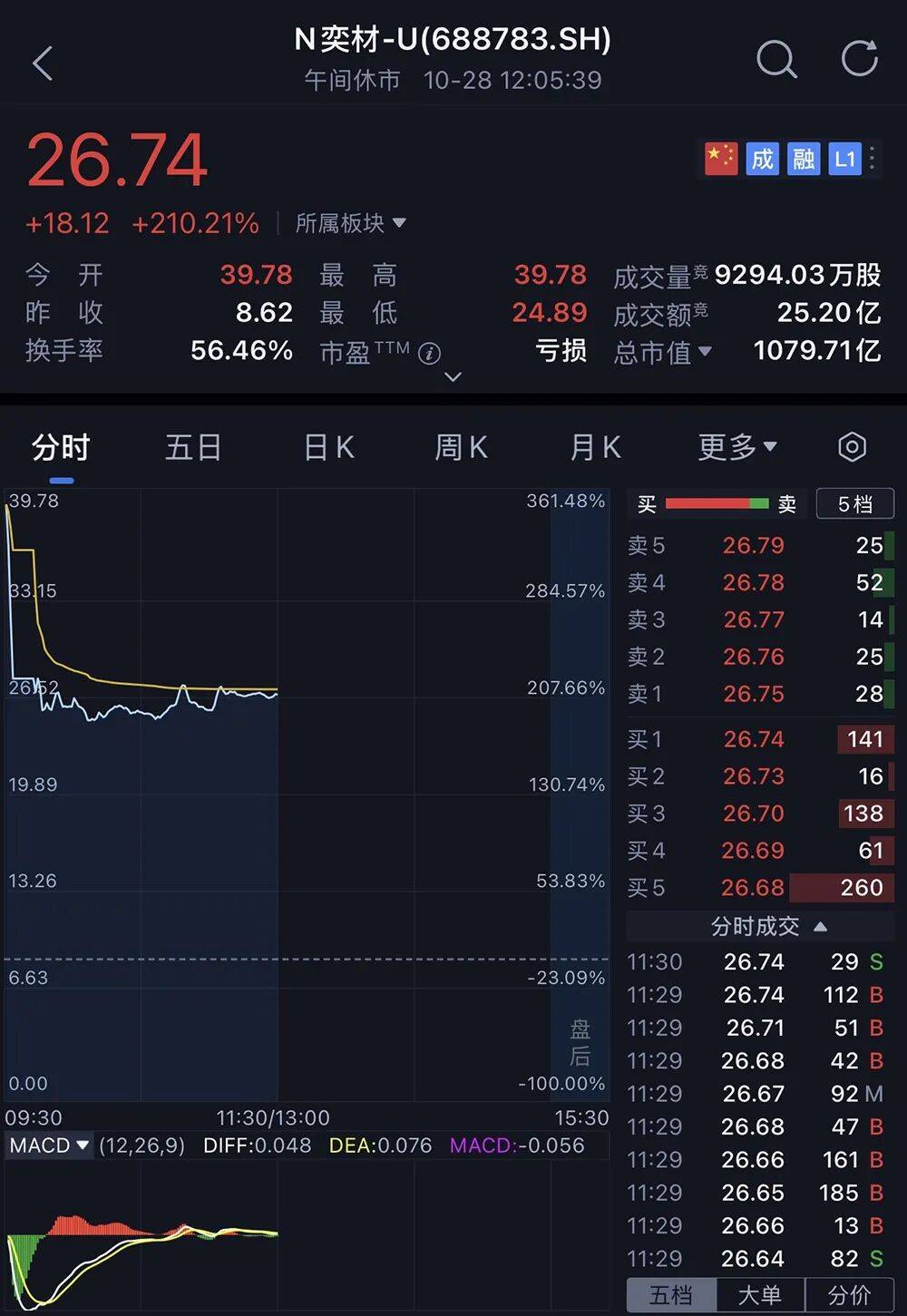 西安奕材发行价为8.62元/股,今日开盘大涨361.48%至39.78元/股,截至午间收盘涨幅达210.21%,总市值为1079.71亿元。