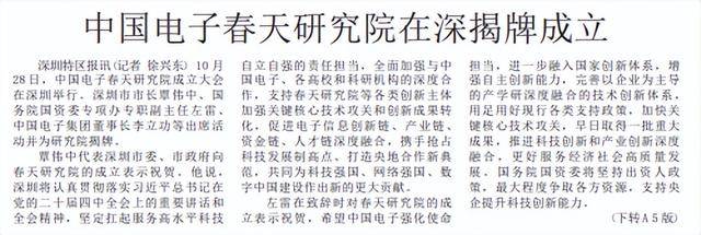 10月28日,中国电子春天研究院成立大会在深圳举行。深圳市市长覃伟中、国务院国资委专项办专职副主任左雷、中国电子集团董事长李立功等出席活动并为研究院揭牌。