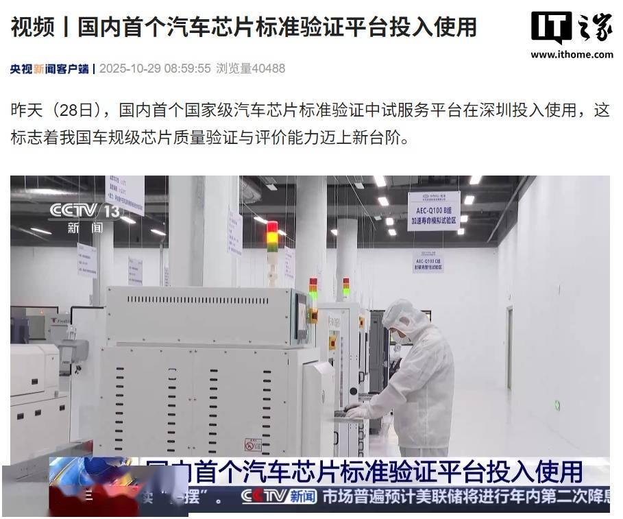IT之家 10 月 29 日消息,据央视新闻报道,国内首个国家级汽车芯片标准验证中试服务平台于 10 月 28 日在深圳投入使用,这标志着我国车规级芯片质量验证与评价能力迈上新台阶。