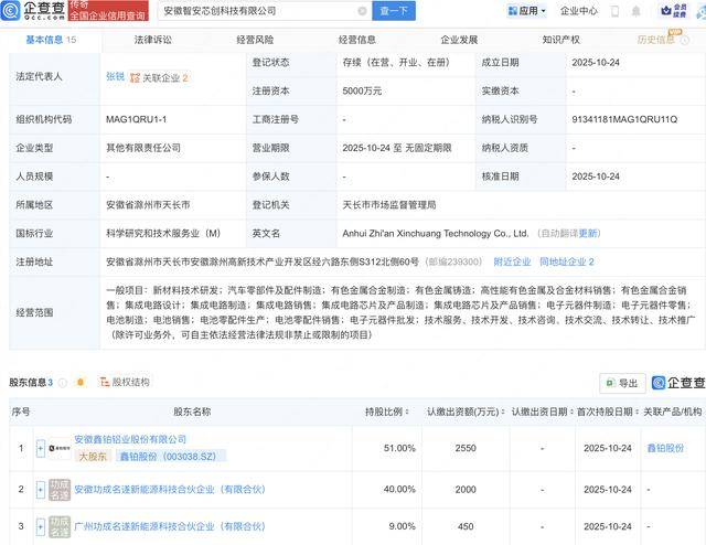企查查APP显示,近日,安徽智安芯创科技有限公司成立,注册资本5000万元,经营范围包含:集成电路设计;集成电路制造;集成电路销售;集成电路芯片及产品制造;集成电路芯片及产品销售等。企查查股权穿透显示,该公司由鑫铂股份(003038)等共同持股。