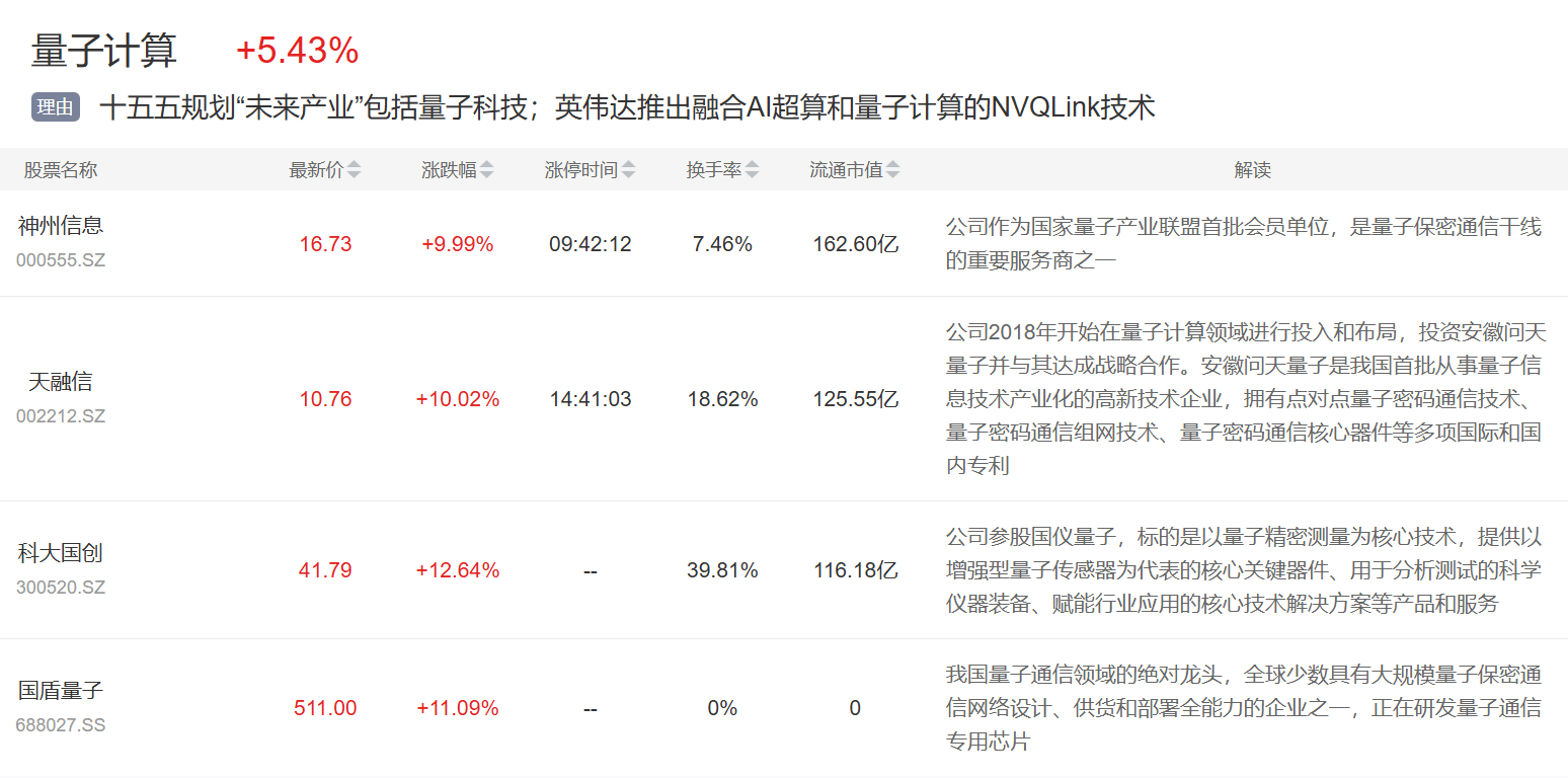 量子计算概念今日再度大涨,神州信息、天融信涨停,科大国创、国盾量子涨幅均超10%。