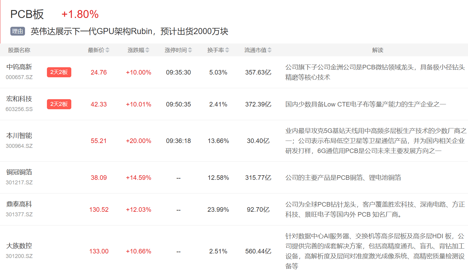 财通证券认为,当前芯片厂商已积极开展224G高速互联技术研究,224G主板以高速PCB为主,对PCB材料的介质损耗提出了极高的要求。此外,2026年1.6T速率数据中心交换机市场启动,英伟达Rubin平台预期发售,AIPCB(高频高速印制电路板)的发展趋势日益明朗且加速推进。