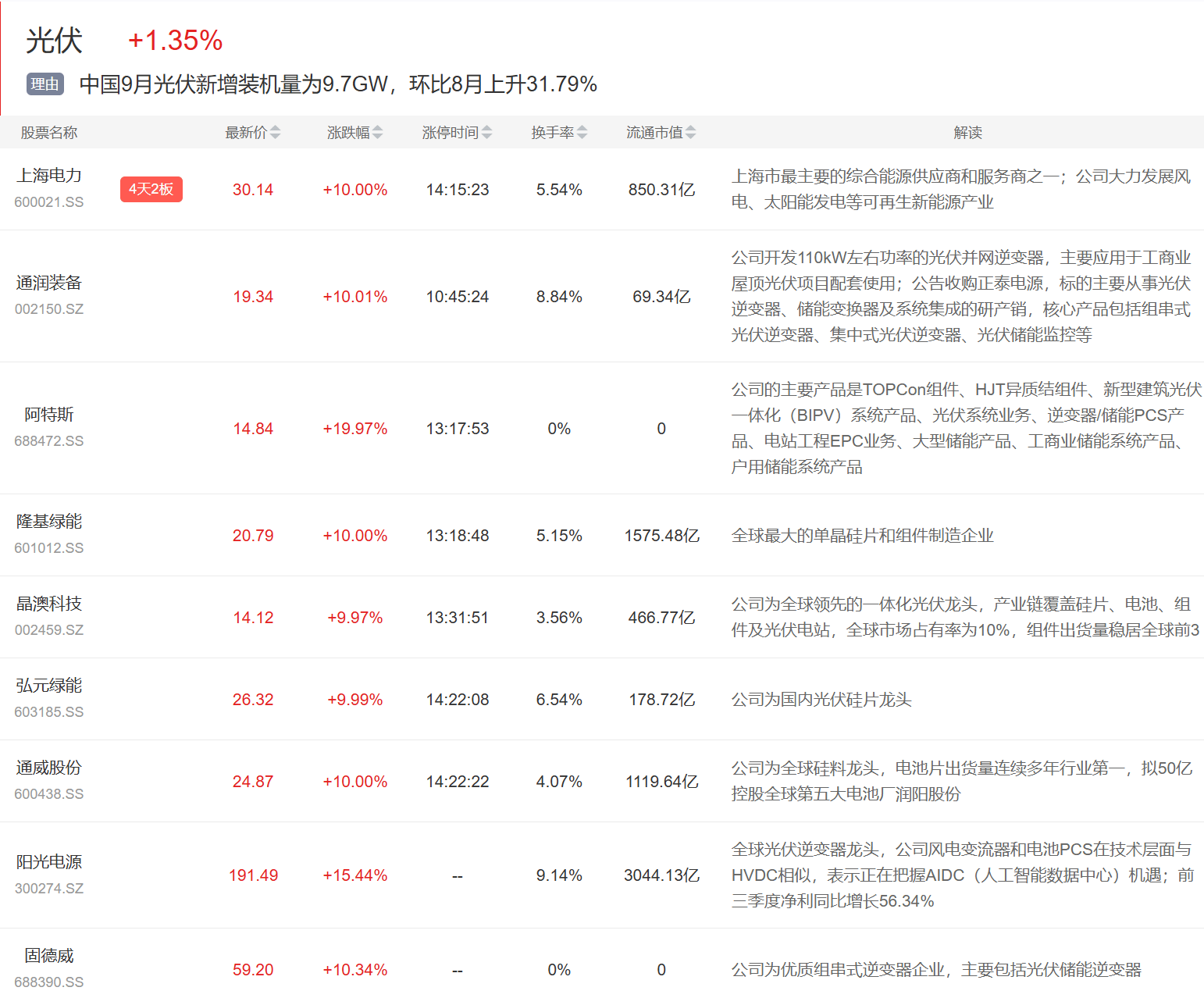 光伏板块今日反弹,上海电力、通润装备、隆基绿能、通威股份等涨停。阳光电源大涨超15%,再创历史新高。