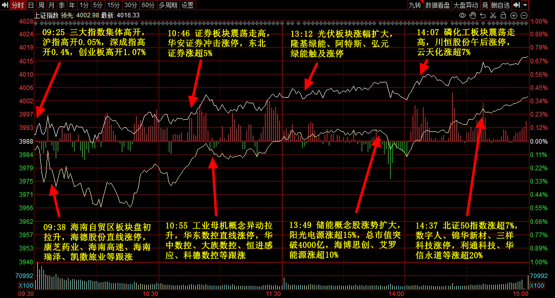 市场全天震荡走强,沪指再度站上4000点,创业板指涨近3%,北证50指数大涨超8%。光伏、储能板块午后爆发,隆基绿能、通威股份等多股涨停,阳光电源大涨创新高。锂矿股走强,大中矿业等封板。有色板块拉升,常铝股份等涨停。海南自贸区概念强势,海汽集团等涨停。下跌方面,银行股走低,成都银行跌超5%。指数黄白二线分化,两市下跌个股略大于上涨家数,今日成交2.29万亿。