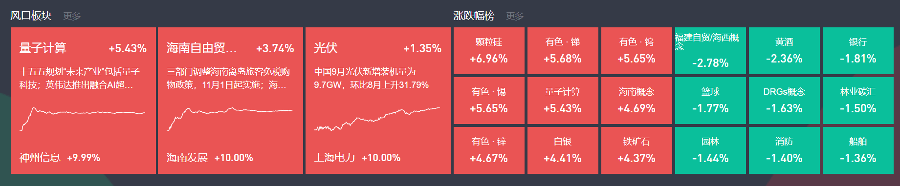 除上述热点外,海南自贸、医药、有色金属等均表现不俗;跌幅方面,深地经济、无人驾驶等跌幅居前。