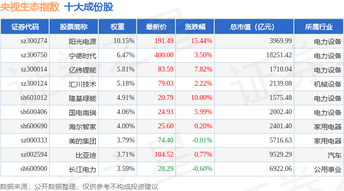 证券之星消息,10月29日,央视生态(399556)指数报收于2999.94点,涨4.71%,成交1156.26亿元,换手率1.23%。当日该指数成份股中,上涨的有35家,阳光电源以15.44%的涨幅领涨,下跌的有13家,汇绿生态以3.43%的跌幅领跌。