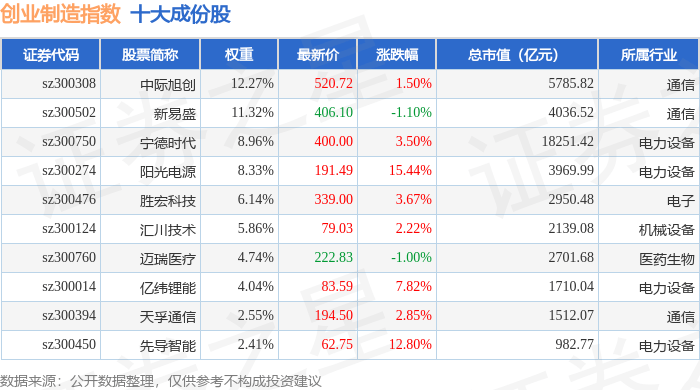 证券之星消息,10月29日,创业制造(399261)指数报收于6402.29点,涨3.43%,成交1994.49亿元,换手率3.66%。当日该指数成份股中,上涨的有39家,阳光电源以15.44%的涨幅领涨,下跌的有11家,长盈精密以2.55%的跌幅领跌。