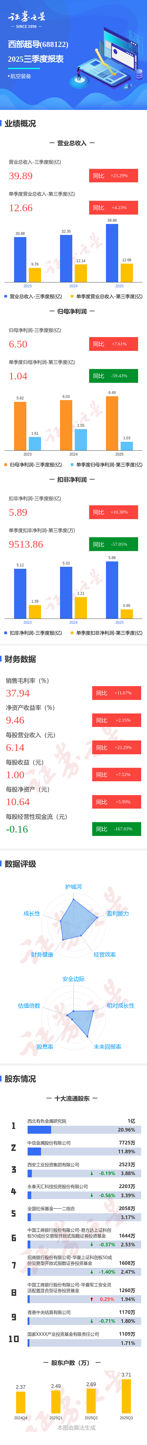 证券之星消息,西部超导2025年三季报显示,前三季度公司主营收入39.89亿元,同比上升23.3%;归母净利润6.5亿元,同比上升7.62%;扣非净利润5.89亿元,同比上升10.39%;其中2025年第三季度,公司单季度主营收入12.66亿元,同比上升4.23%;单季度归母净利润1.04亿元,同比下降59.44%;单季度扣非净利润9513.86万元,同比下降57.05%;负债率48.2%,投资收益733.73万元,财务费用3491.15万元,毛利率37.94%。